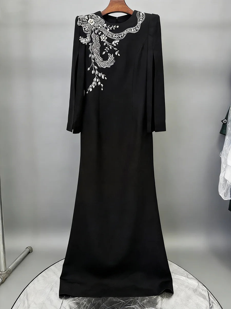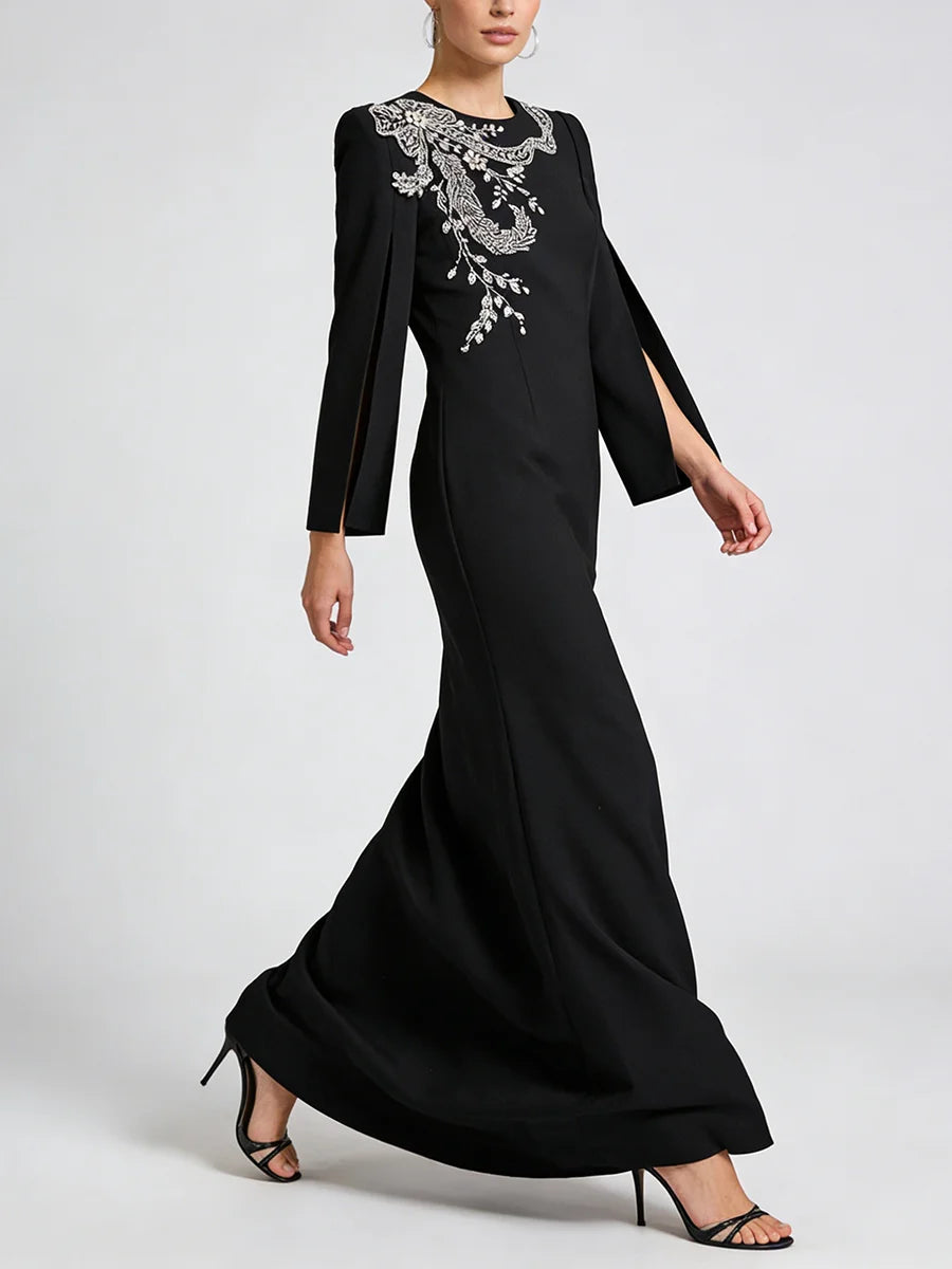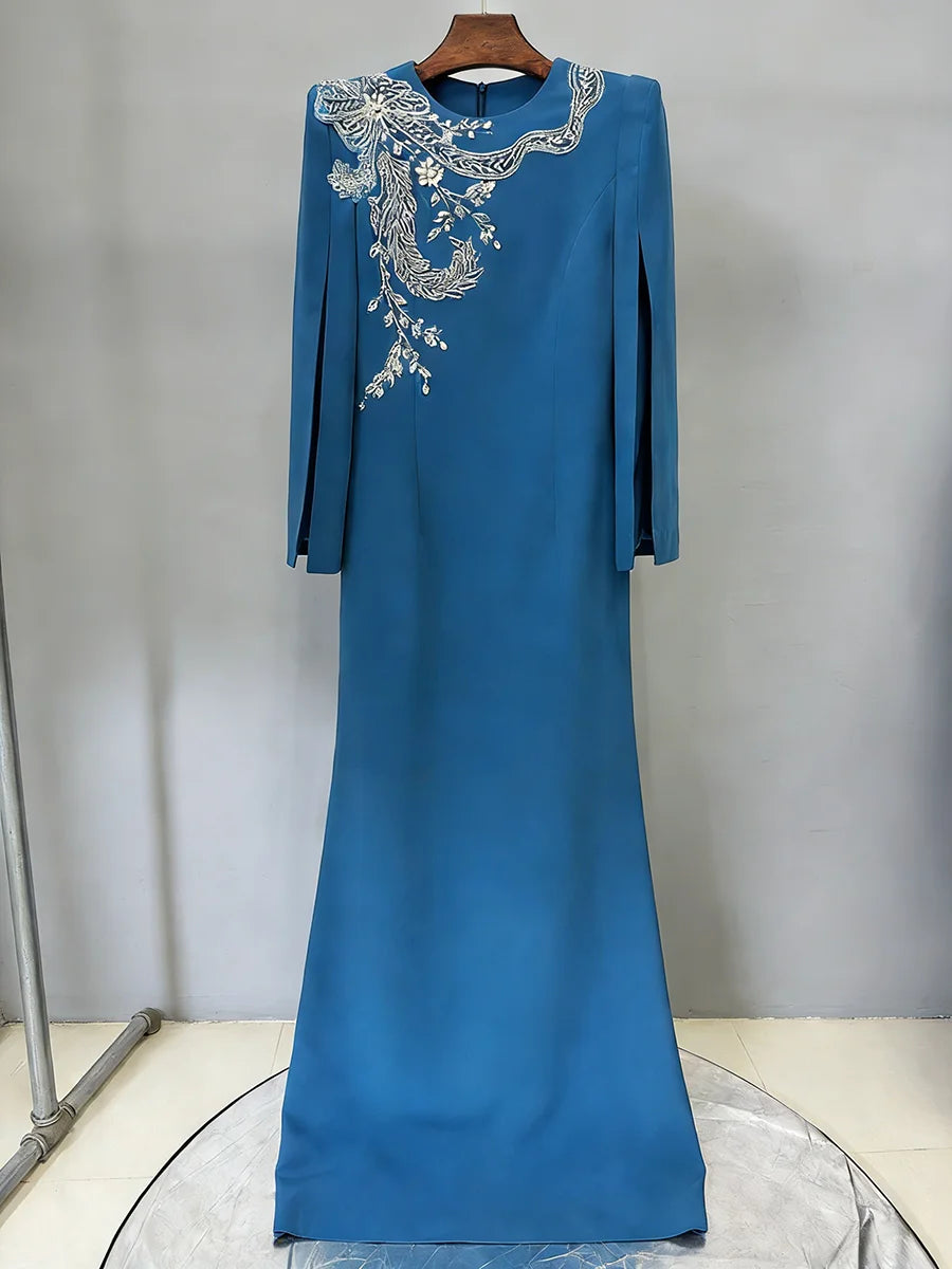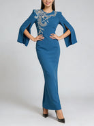 Make a regal entrance in this extraordinary mermaid gown that marries dramatic cape sleeves with exquisite embroidery. The empire waistline and flowing silhouette create an ethereal, goddess-inspired look perfect for the most elegant affairs.