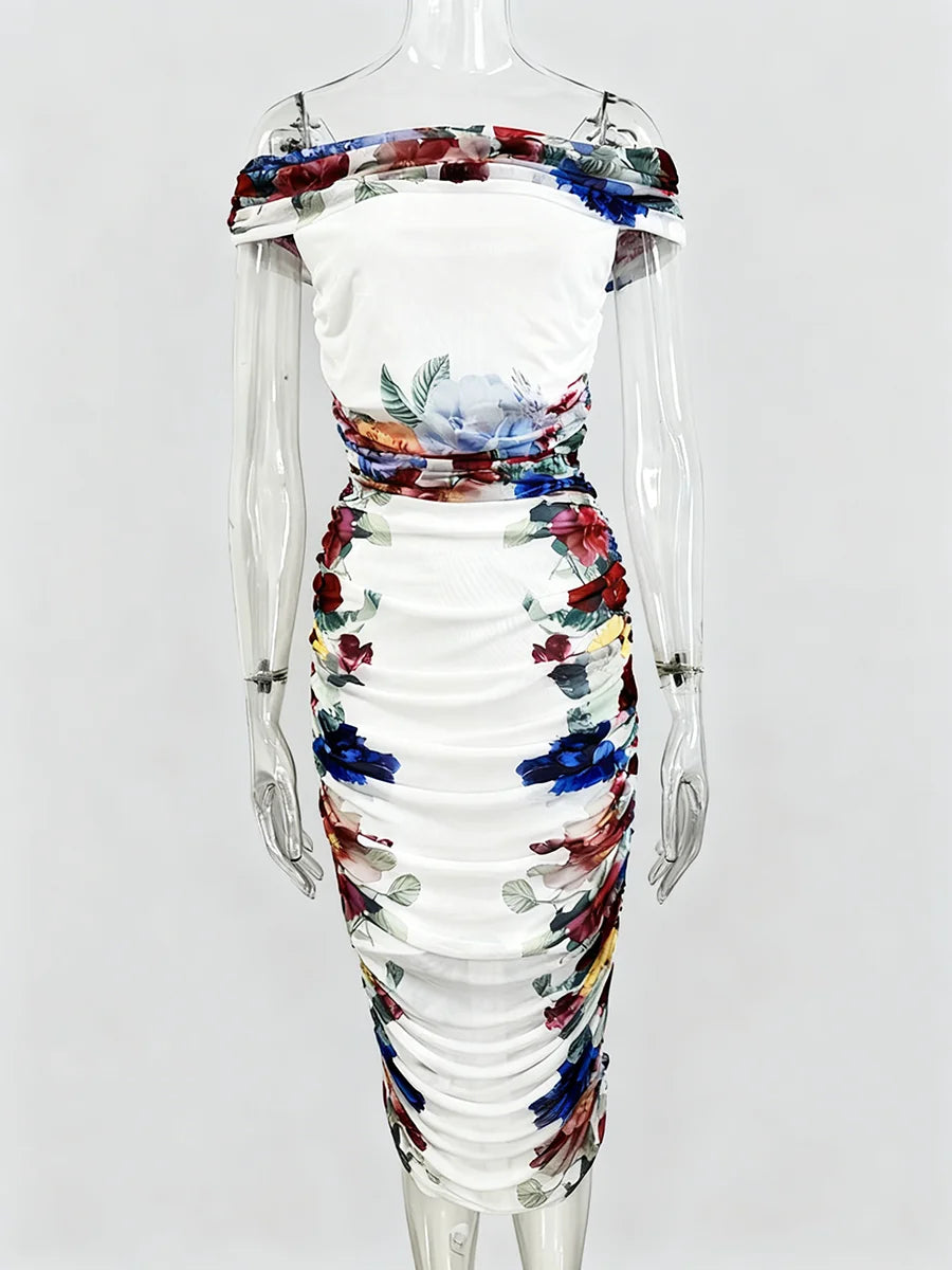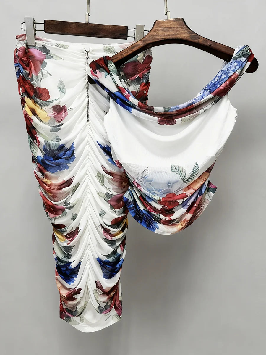 Embrace romantic elegance with this exquisite off-shoulder mesh and floral skirt set. Designed for the modern woman who appreciates refined details, this two-piece ensemble features delicate mesh ruching and a stunning floral skirt that creates an unforgettable silhouette.