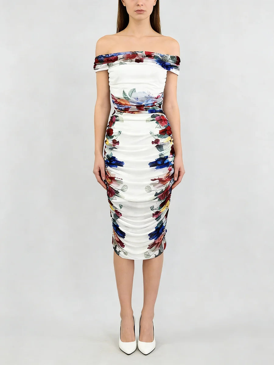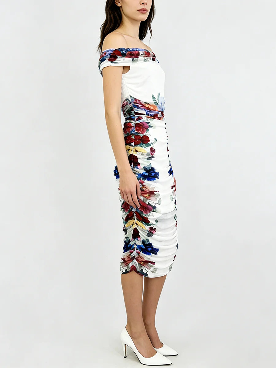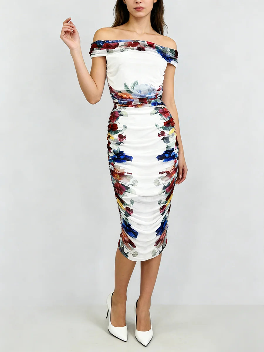 The off-shoulder mesh top features intricate ruching that adds texture and visual interest, while the floral skirt brings a touch of romance and femininity. The empire waistline creates a lengthening effect, and the slim sheath silhouette ensures a polished, sophisticated look. This coordinated set takes the guesswork out of styling while delivering maximum impact.