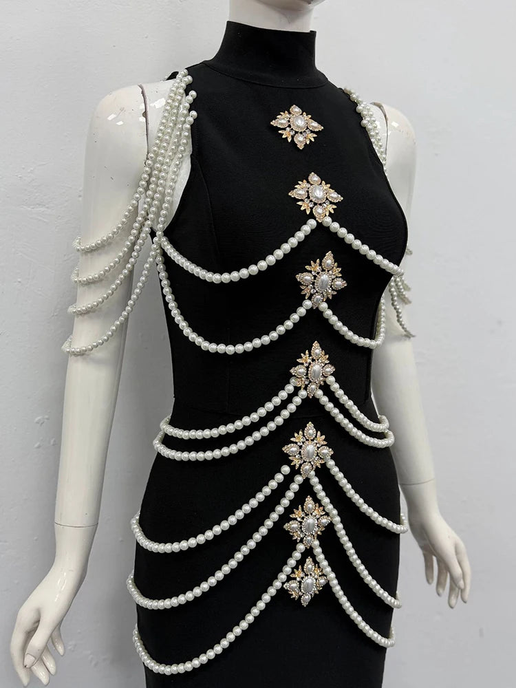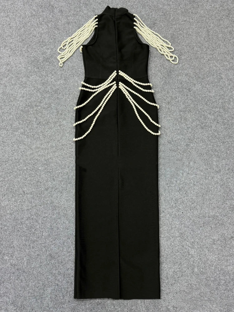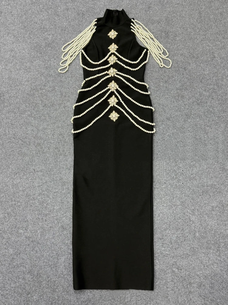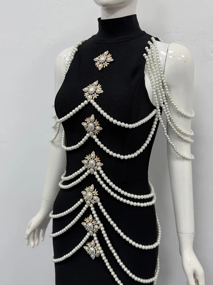 Make an unforgettable entrance in this luxurious evening gown adorned with exquisite pearl draping and sparkling crystal embellishments. The sophisticated halter neckline and sleek sheath silhouette create a stunning figure-flattering look, while the natural waistline and ankle-length hem exude timeless elegance. Crafted from a premium polyester-spandex blend with medium stretch for comfortable movement, this gown is perfect for galas, black-tie events, and the most special occasions.