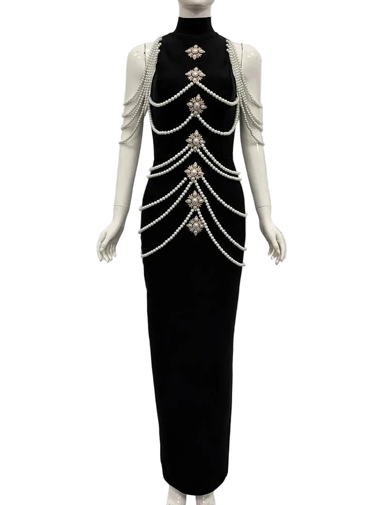 Trend4us Luxe Pearl Draped Crystal Embellished Evening Gown
