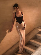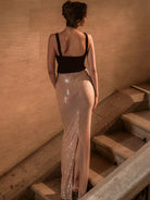 Pair with metallic heels and minimal jewelry to let the sequin details shine. Perfect for black-tie events, evening galas, formal weddings, or any occasion where you want to make a glamorous entrance. The pleated fabric creates graceful movement while the sequin contrast adds just the right amount of sparkle.