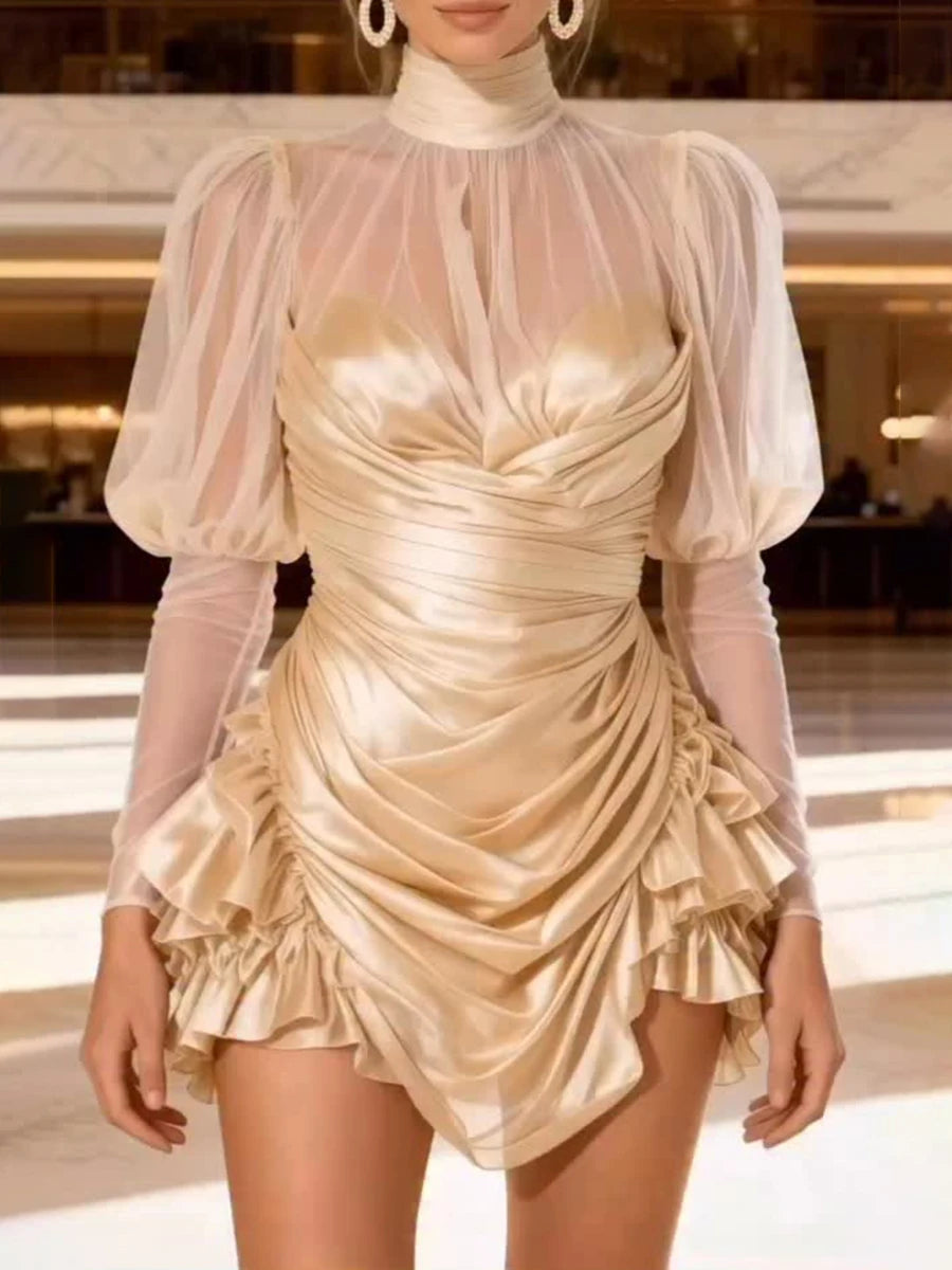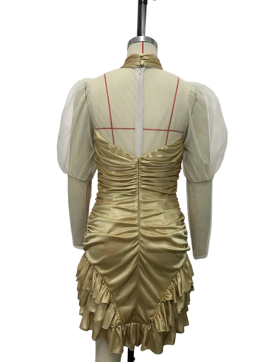 Luxe Sheer Mesh Ruched Ruffle Mini Dress