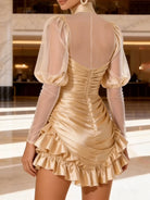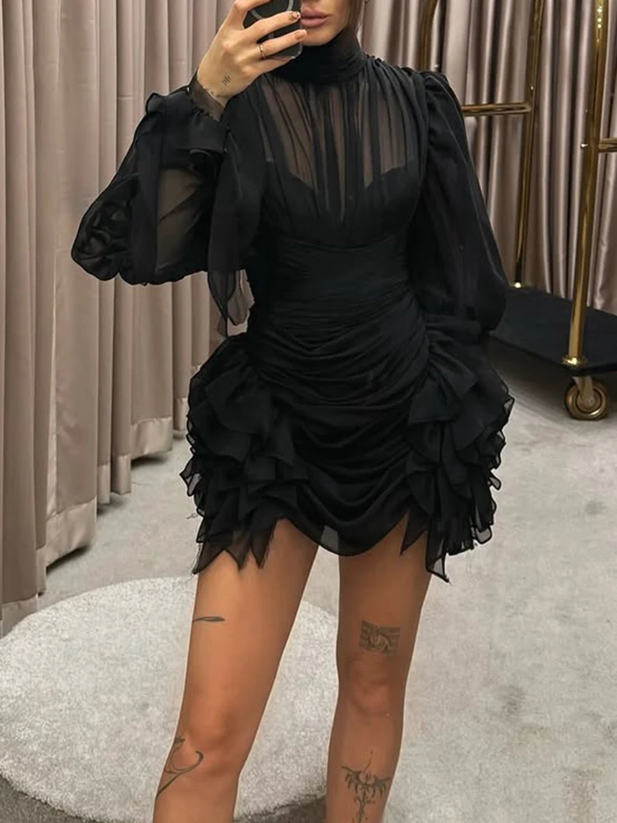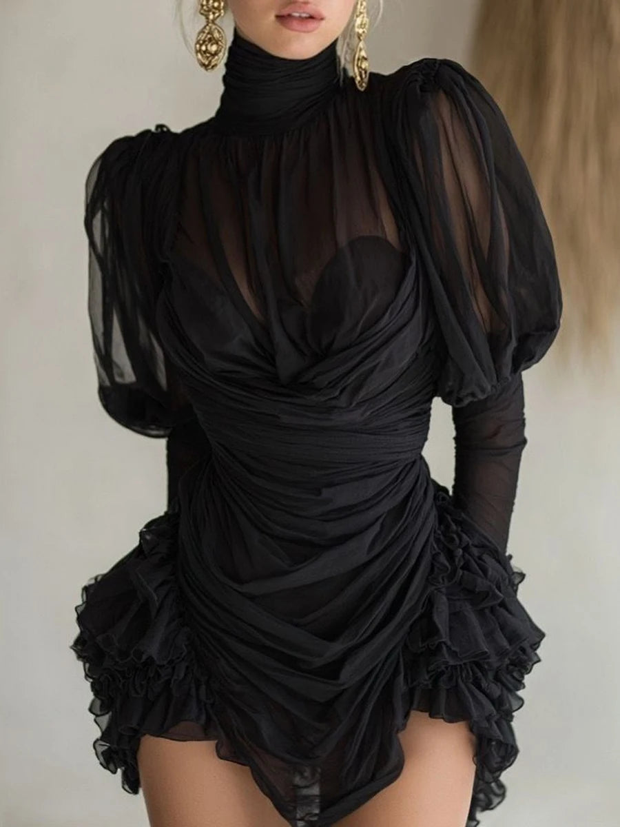 This dress is your go-to for cocktail parties, date nights, upscale dinners, and celebratory events. The combination of sheer mesh and ruffle details creates a balanced look that's both daring and refined. Pair with strappy heels and a clutch for evening glamour, or add statement jewelry to elevate the look even further. The puff sleeves add a touch of drama that photographs beautifully.