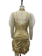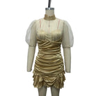 The strategic placement of sheer mesh panels creates visual interest while maintaining elegance, and the ruched detailing flatters your figure by adding dimension and texture. The puff sleeves bring a romantic, fashion-forward element that balances the mini length perfectly.