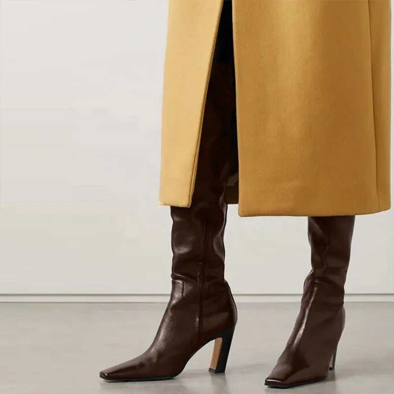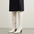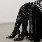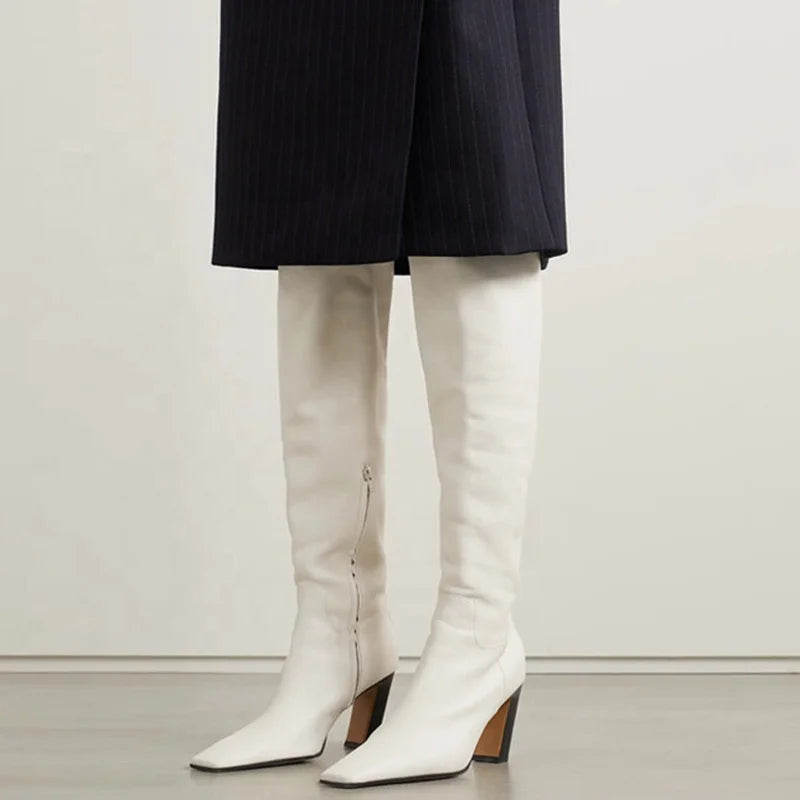 The Trend4us Luxe Thigh-High Pointed Toe Heeled Boots are the ultimate power piece. Crafted in genuine leather with an over-the-knee silhouette, square toe, and a confident heel, these boots command attention from every angle — available in Black, Black Print, White, and Brown for maximum versatility.