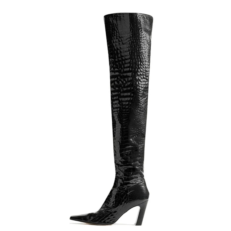 • Over-the-knee / thigh-high silhouette for a bold, dramatic look