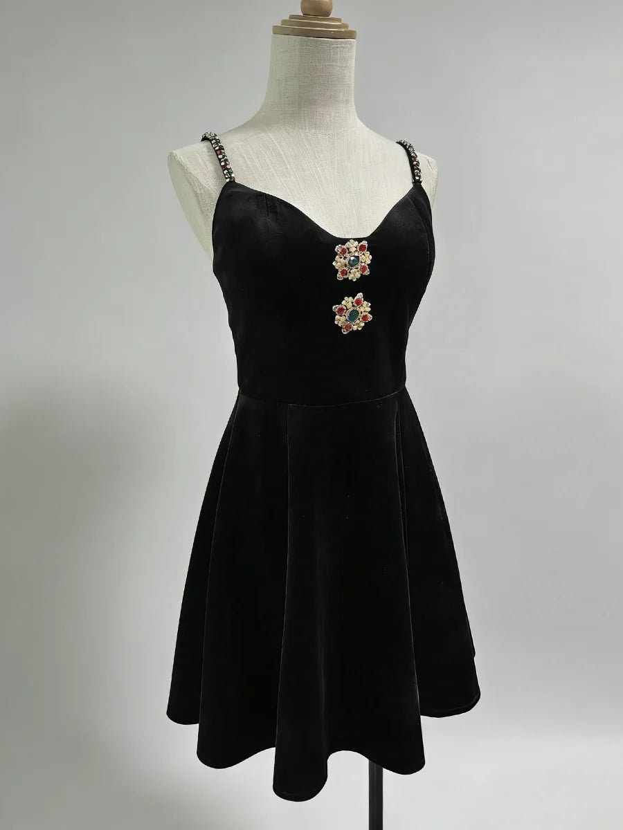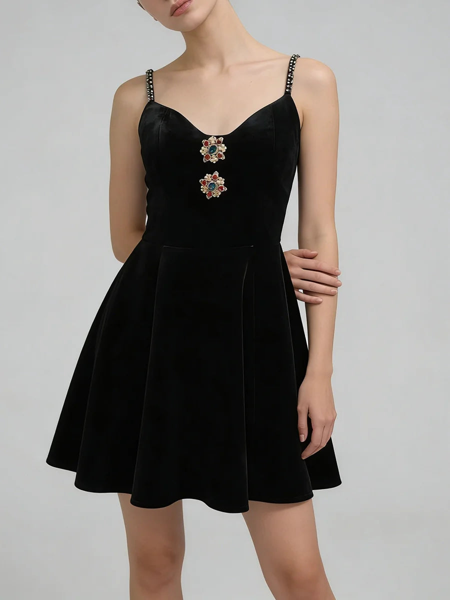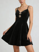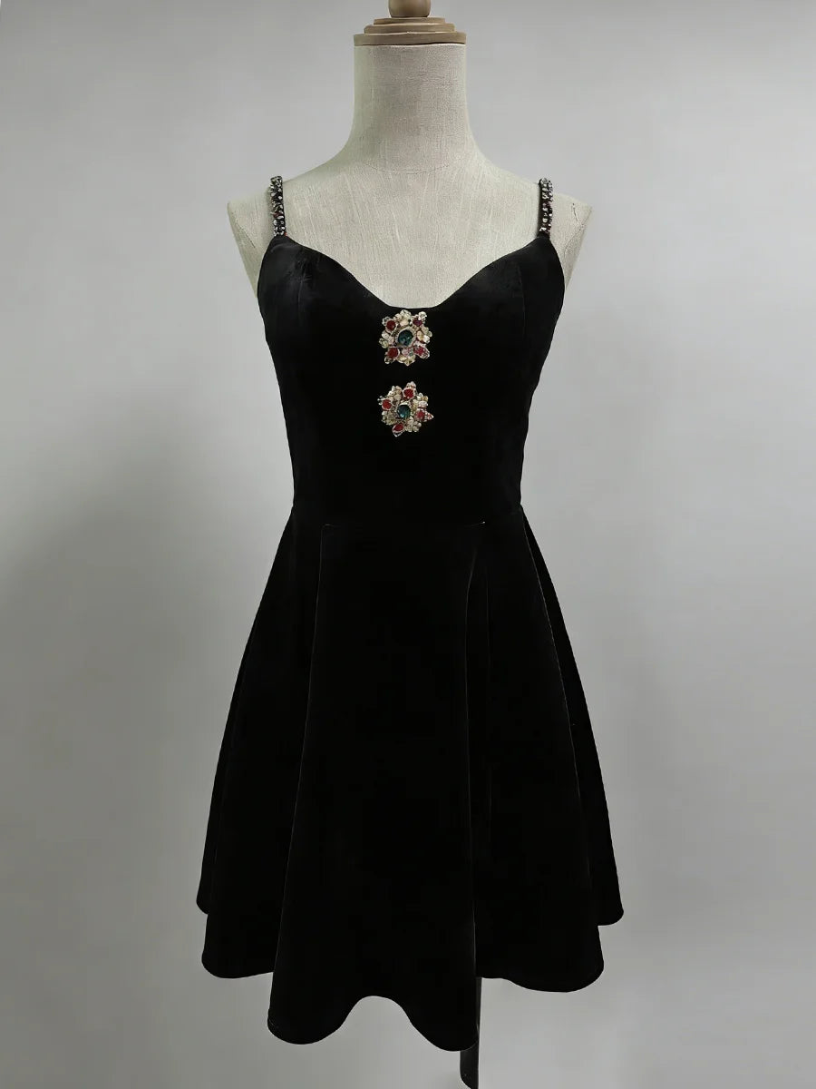 Make a luxurious statement with this velvet jewel-embellished mini dress, a stunning blend of rich texture and sparkling glamour. This captivating dress features sumptuous velvet fabric adorned with intricate jewel embellishments, delicate spaghetti straps, and a flattering empire waistline. The slim-fit silhouette and mini length create a modern, sophisticated look that's perfect for the woman who loves to shine at every special occasion.