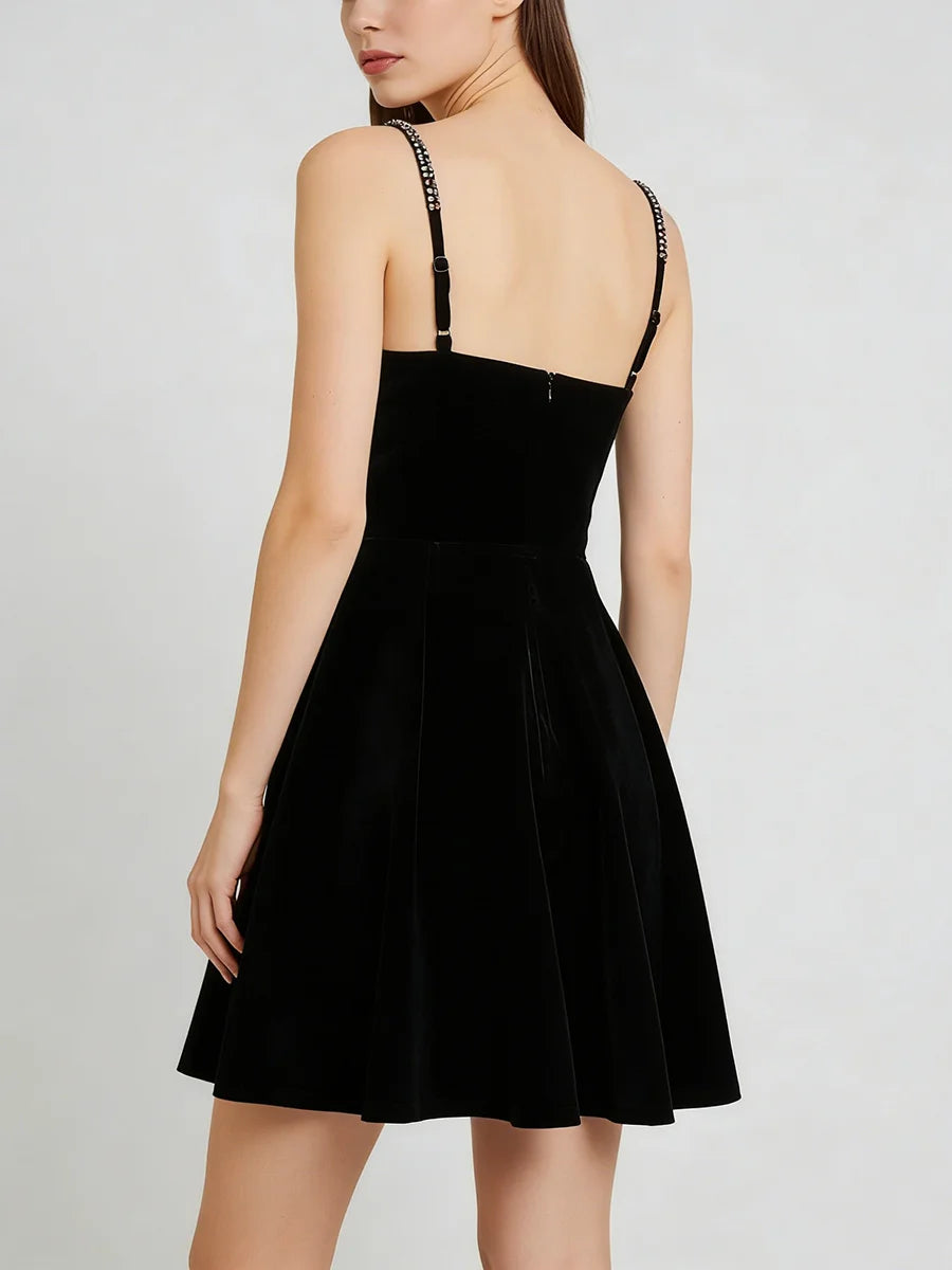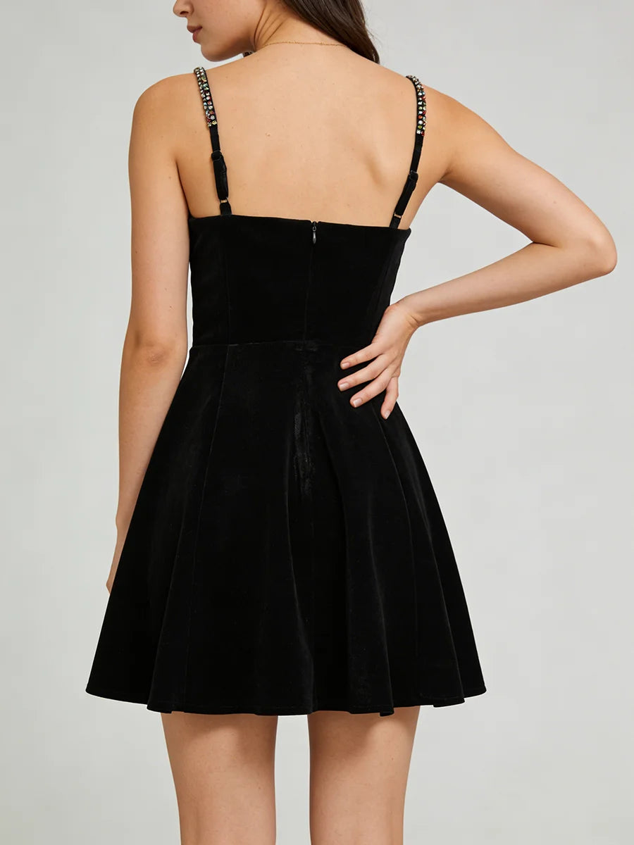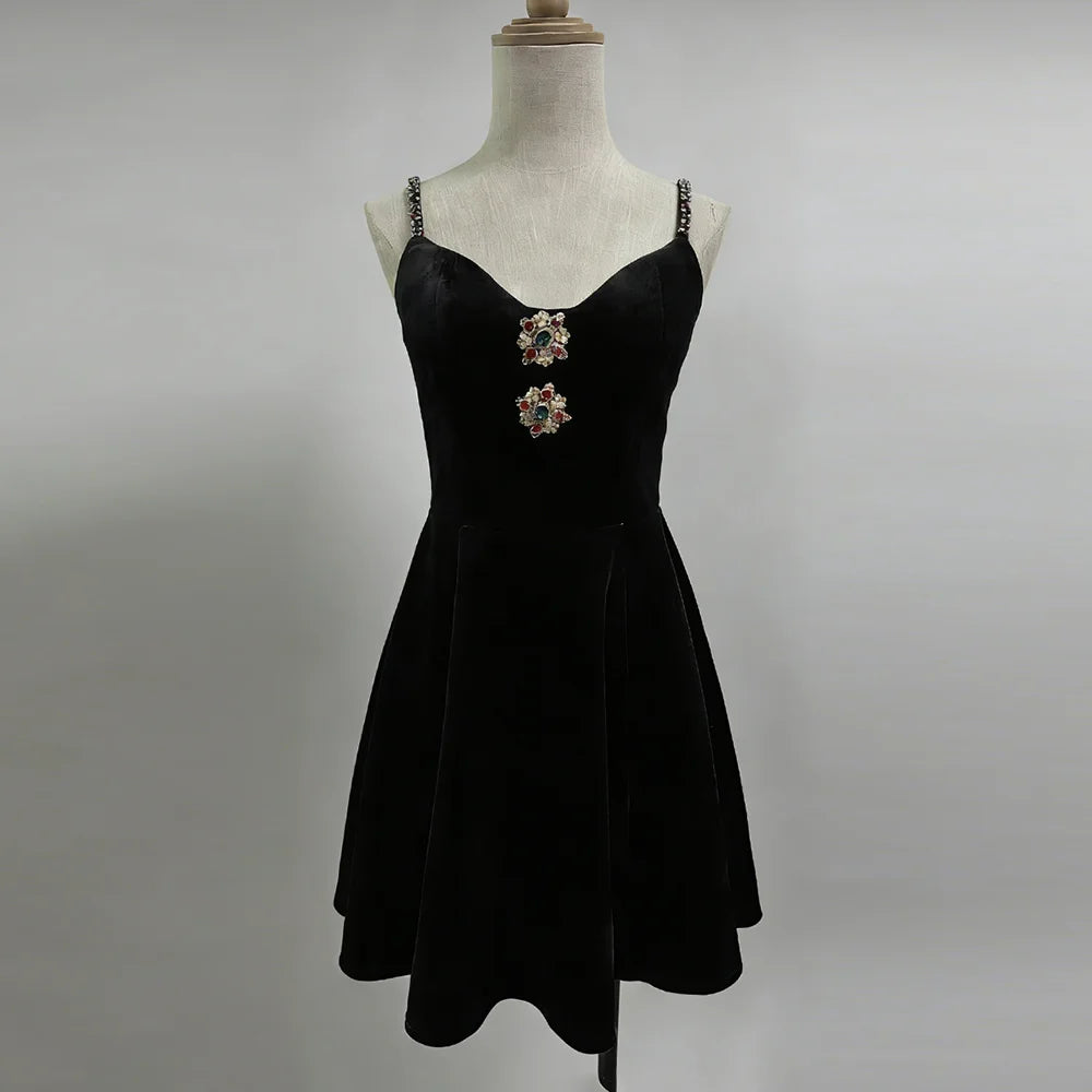 Make a luxurious statement with this velvet jewel-embellished mini dress, a stunning blend of rich texture and sparkling glamour. This captivating dress features sumptuous velvet fabric adorned with intricate jewel embellishments, delicate spaghetti straps, and a flattering empire waistline. The slim-fit silhouette and mini length create a modern, sophisticated look that's perfect for the woman who loves to shine at every special occasion.