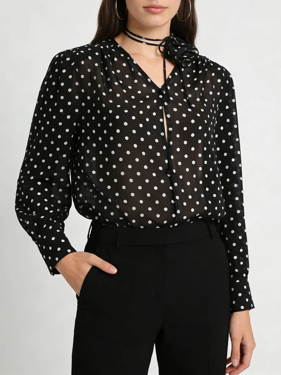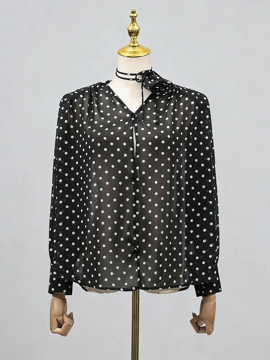 Add a touch of romantic whimsy to your wardrobe with this enchanting polka dot sheer blouse featuring delicate 3D flower embellishments and an elegant tie-neck detail. The sheer fabric creates an ethereal, feminine look that's perfect for layering or making a statement on its own.