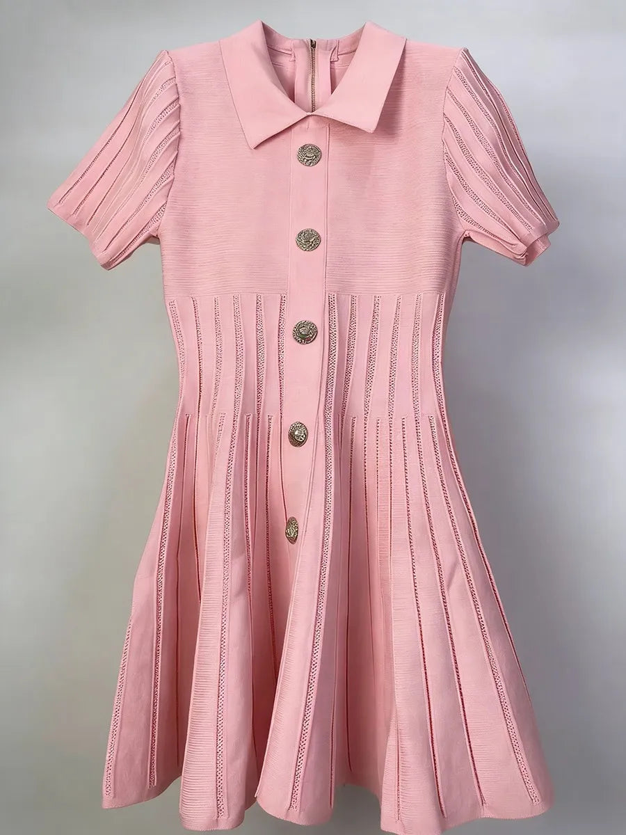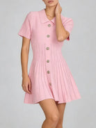 Elevate your wardrobe with this sculpted collared pleated knit mini dress that seamlessly blends structured sophistication with comfortable stretch. The architectural pleating and tailored collar create a polished silhouette perfect for transitioning from office to evening with effortless style.