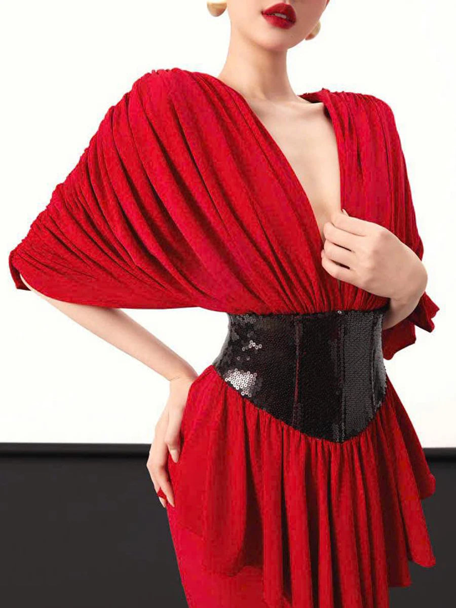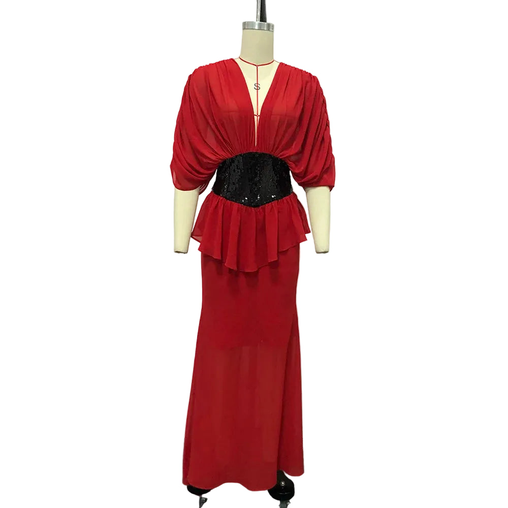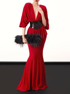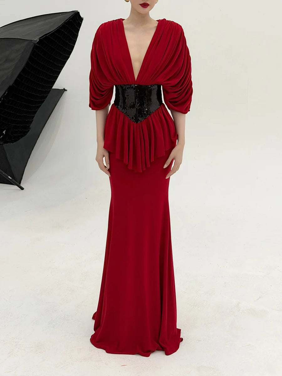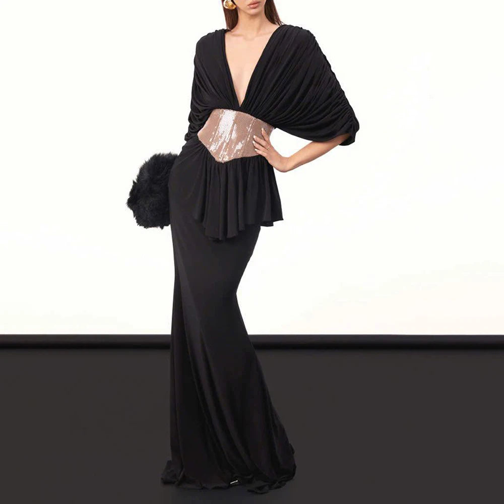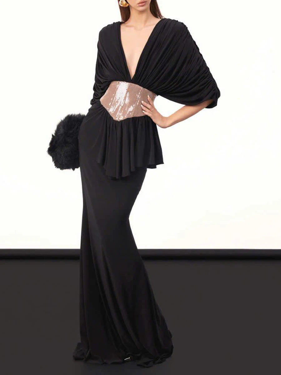 Make a dramatic entrance in the Trend4us Luxe Draped Plunge Sequin Waist Mermaid Gown, a stunning statement piece designed for unforgettable evenings. This elegant gown features a deep plunging neckline framed by beautifully draped fabric that creates a sophisticated and flattering silhouette. The sculpted waist is accentuated with a shimmering sequin panel that highlights the figure and adds a touch of glamorous contrast.