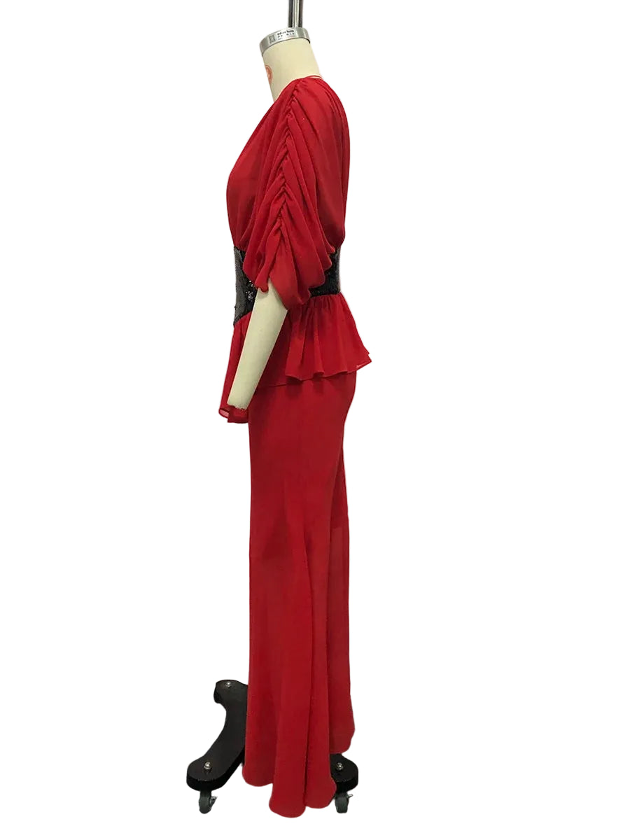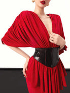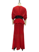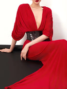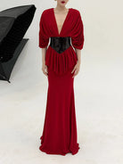 Flowing effortlessly into a sleek mermaid-style skirt, the dress elongates the body and enhances natural curves, delivering a refined red-carpet look. The soft, fluid fabric drapes gracefully with every step, while the bold design balances modern glamour with timeless elegance.