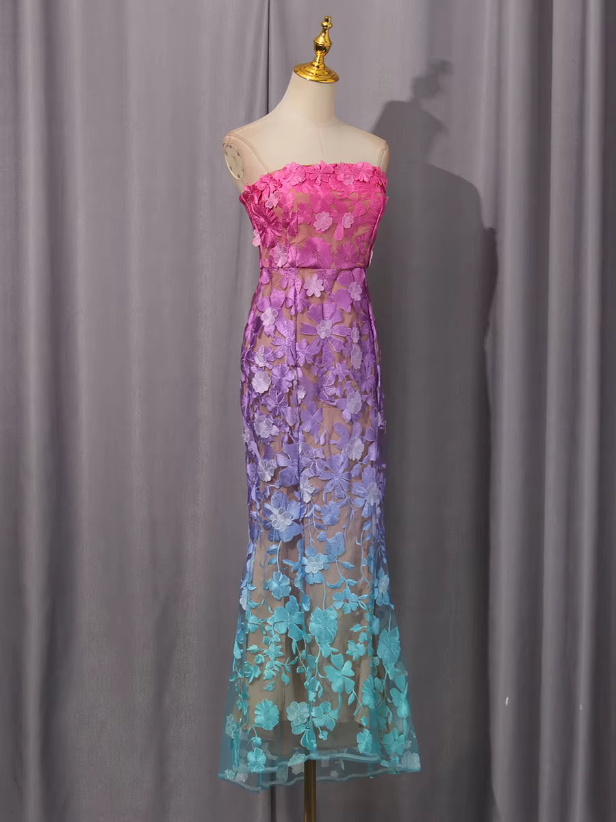 Styling Suggestions: Pair with statement earrings and an elegant updo to highlight the strapless neckline. Style with strappy heels and a clutch for formal events. Consider a delicate shawl or bolero for coverage during ceremonies. The gradient and embroidery make this gown a conversation piece that needs minimal accessorizing.