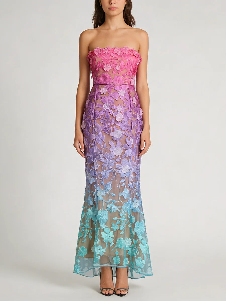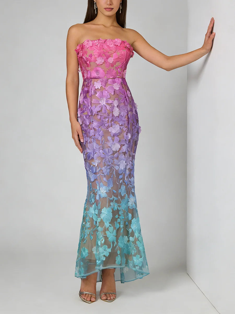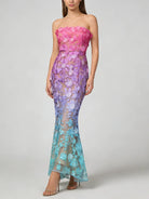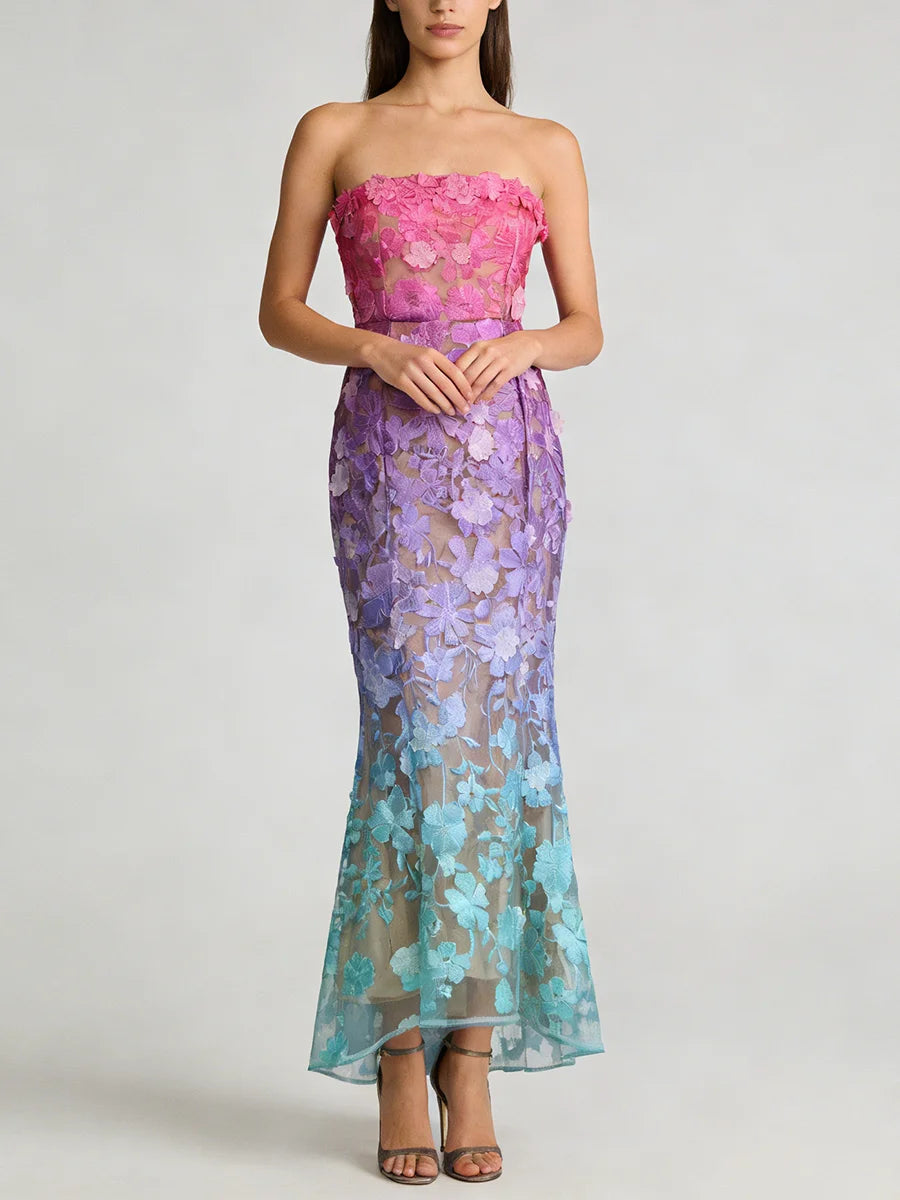 Make an unforgettable entrance in this strapless embroidered floral evening gown. The trumpet mermaid silhouette hugs your curves before flaring dramatically at the hem, while intricate floral embroidery and gradient color create a show-stopping effect for your most important occasions.