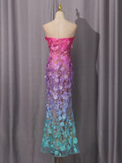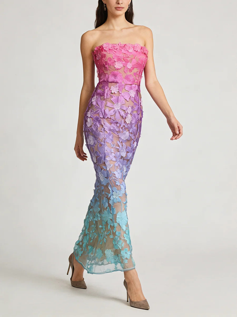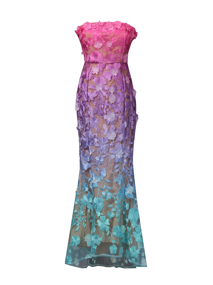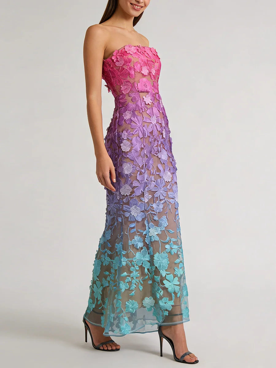 Make an unforgettable entrance in this strapless embroidered floral evening gown. The trumpet mermaid silhouette hugs your curves before flaring dramatically at the hem, while intricate floral embroidery and gradient color create a show-stopping effect for your most important occasions.