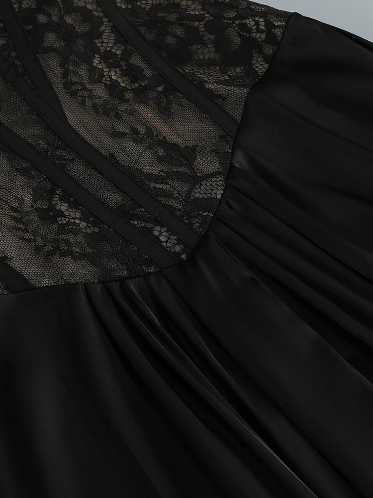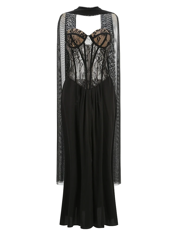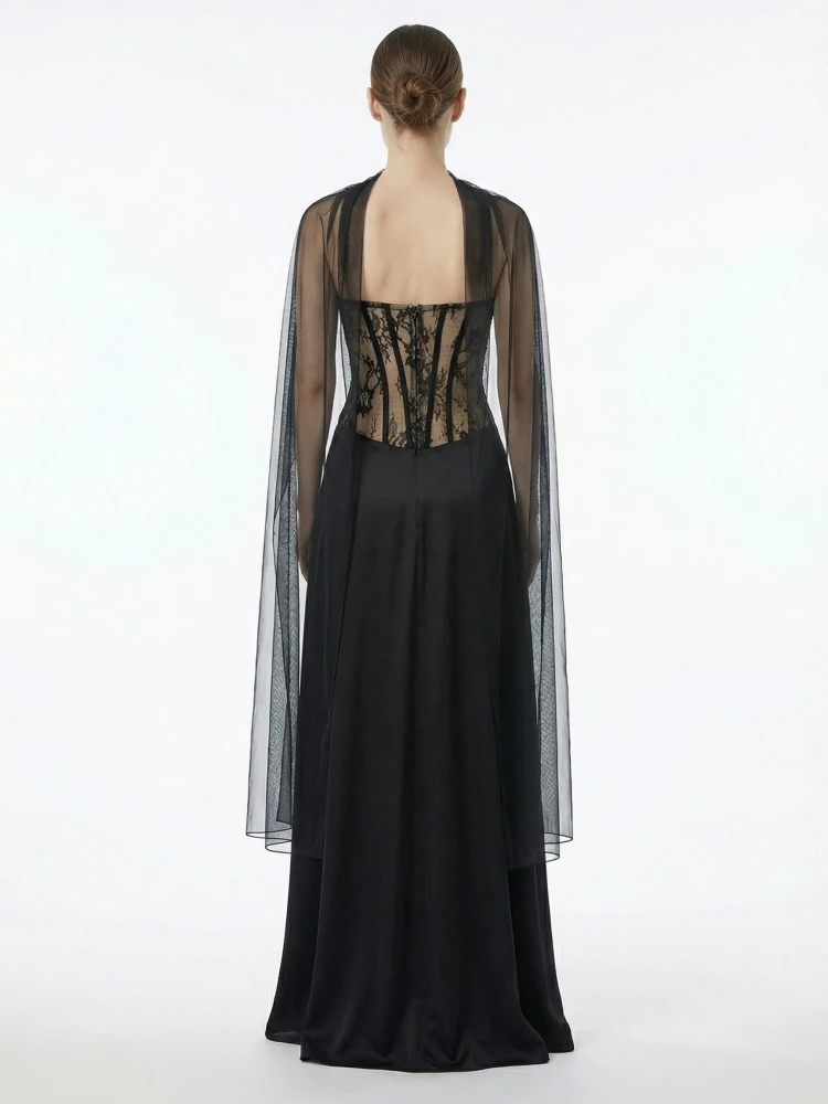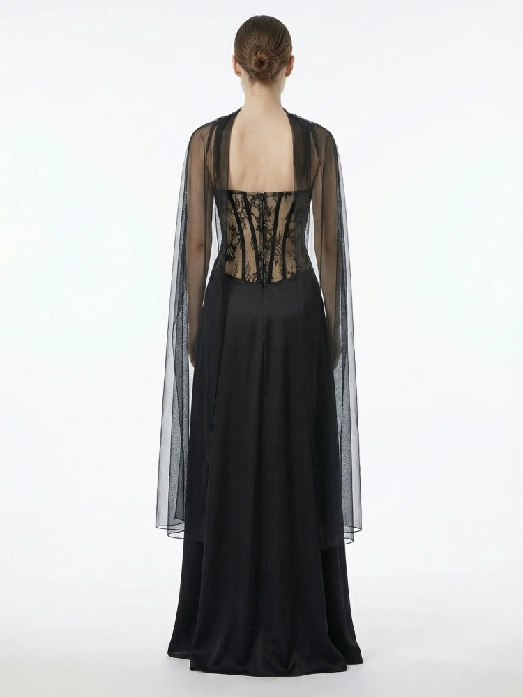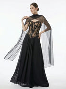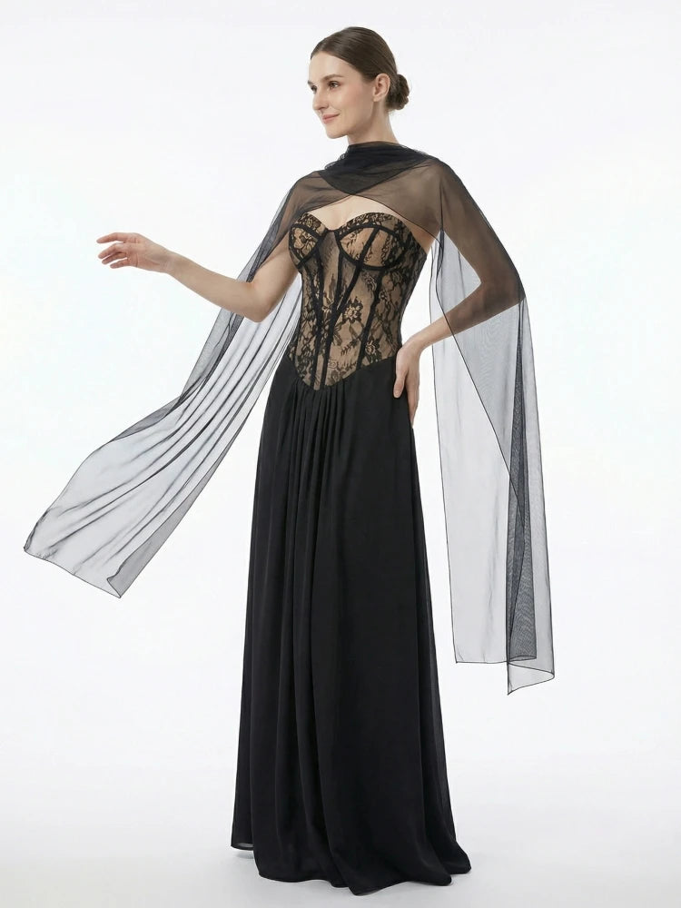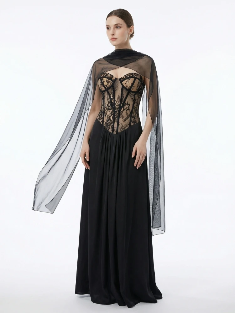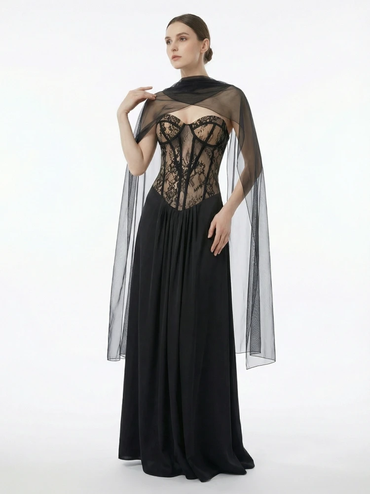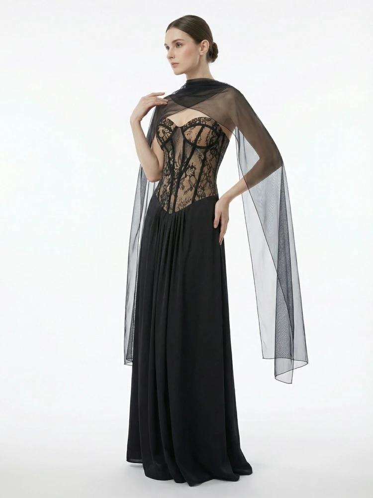 The sheer lace bodice is beautifully structured for a corsetry-inspired fit, flowing into a soft chiffon maxi skirt that moves with effortless grace. A lightweight chiffon shawl overlay drapes delicately over the shoulders, adding ethereal movement and elevated drama to the silhouette. Perfect for formal evenings, galas, and statement occasions.