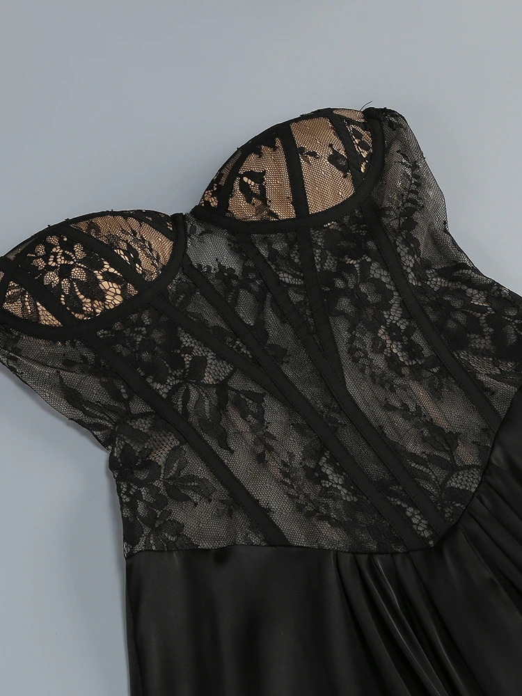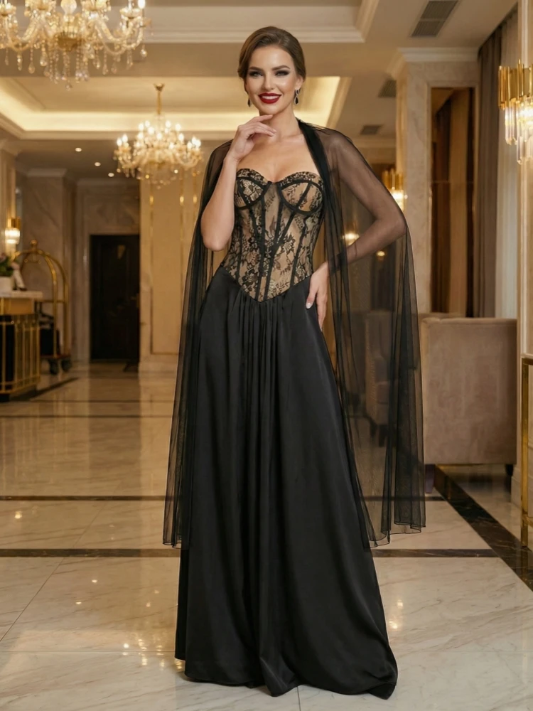 Make an unforgettable entrance in the Trend4us Strapless Sheer Lace Corset Chiffon Shawl Maxi Gown, a dramatic fusion of couture elegance and modern romance. Designed with a sculpted strapless lace corset, this gown defines the waist and highlights the décolletage with refined sensuality.
