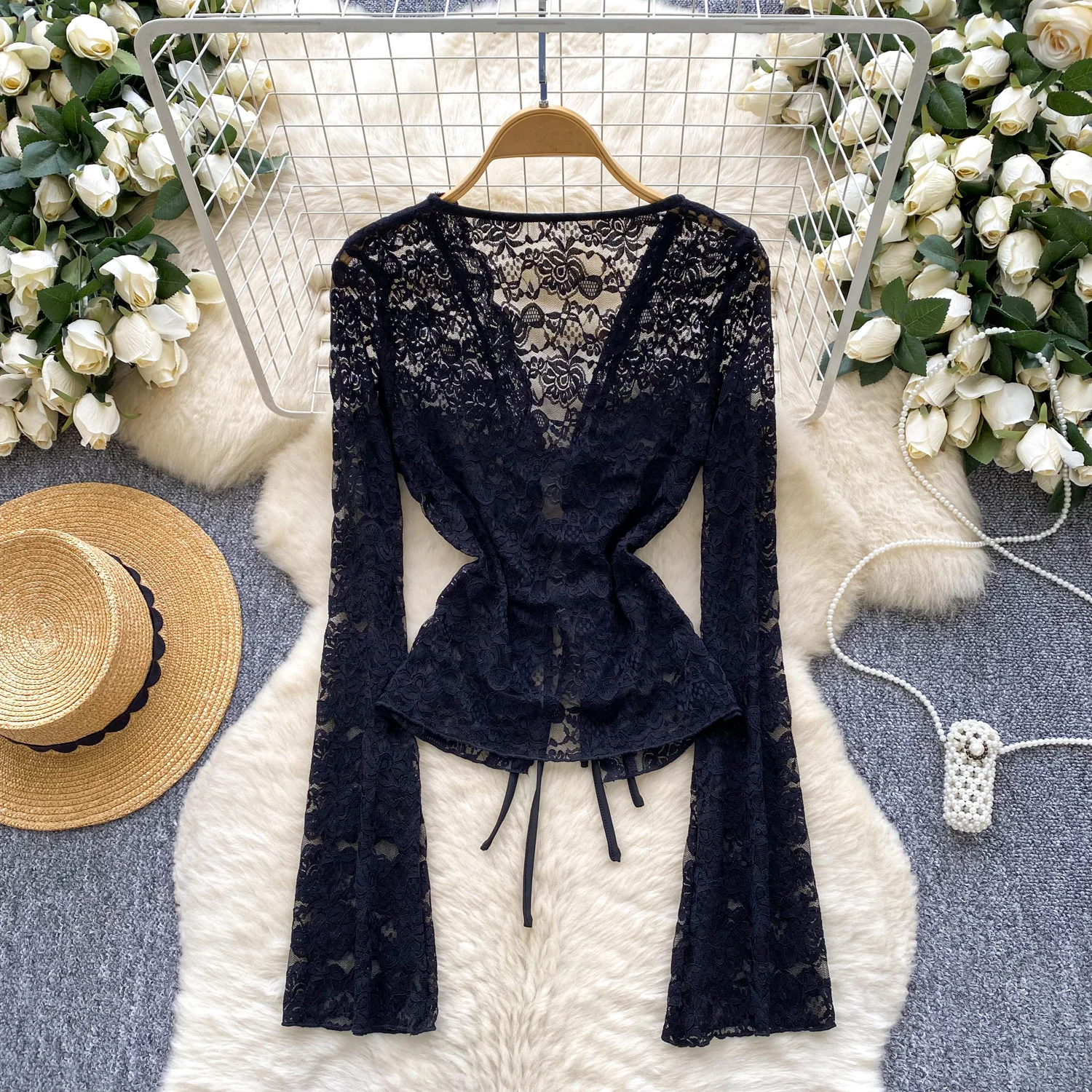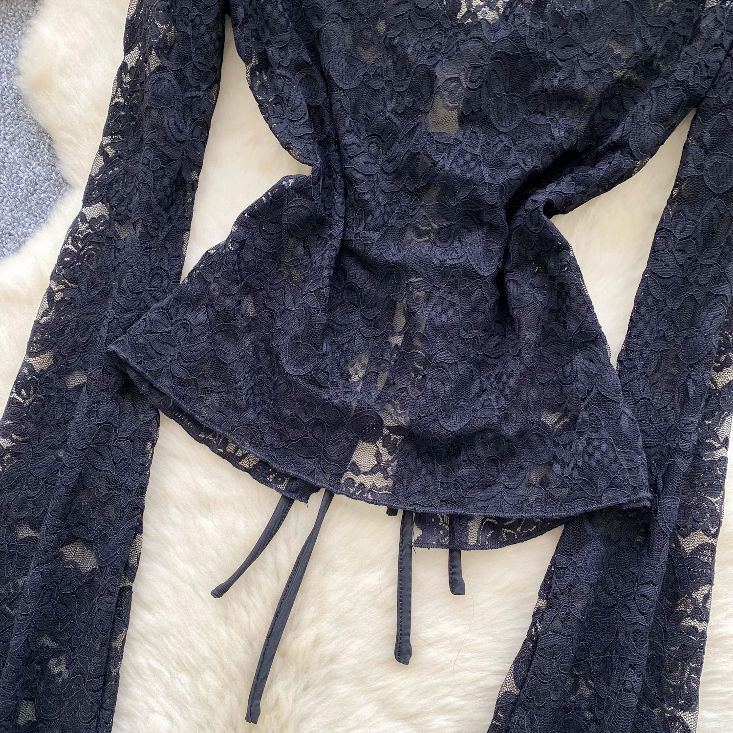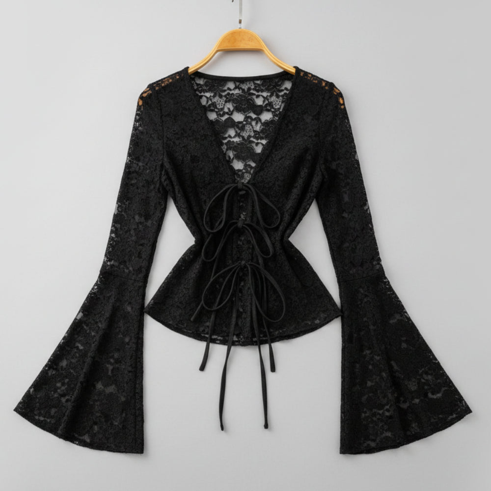 Bold, refined, and statement-driven, the Trend4us Vintage Lace-Up Sheer Lace Long Sleeve Blouse delivers elevated vintage energy with a modern edge. Crafted from intricate sheer lace, this blouse features a deep V-neckline with adjustable lace-up detailing.