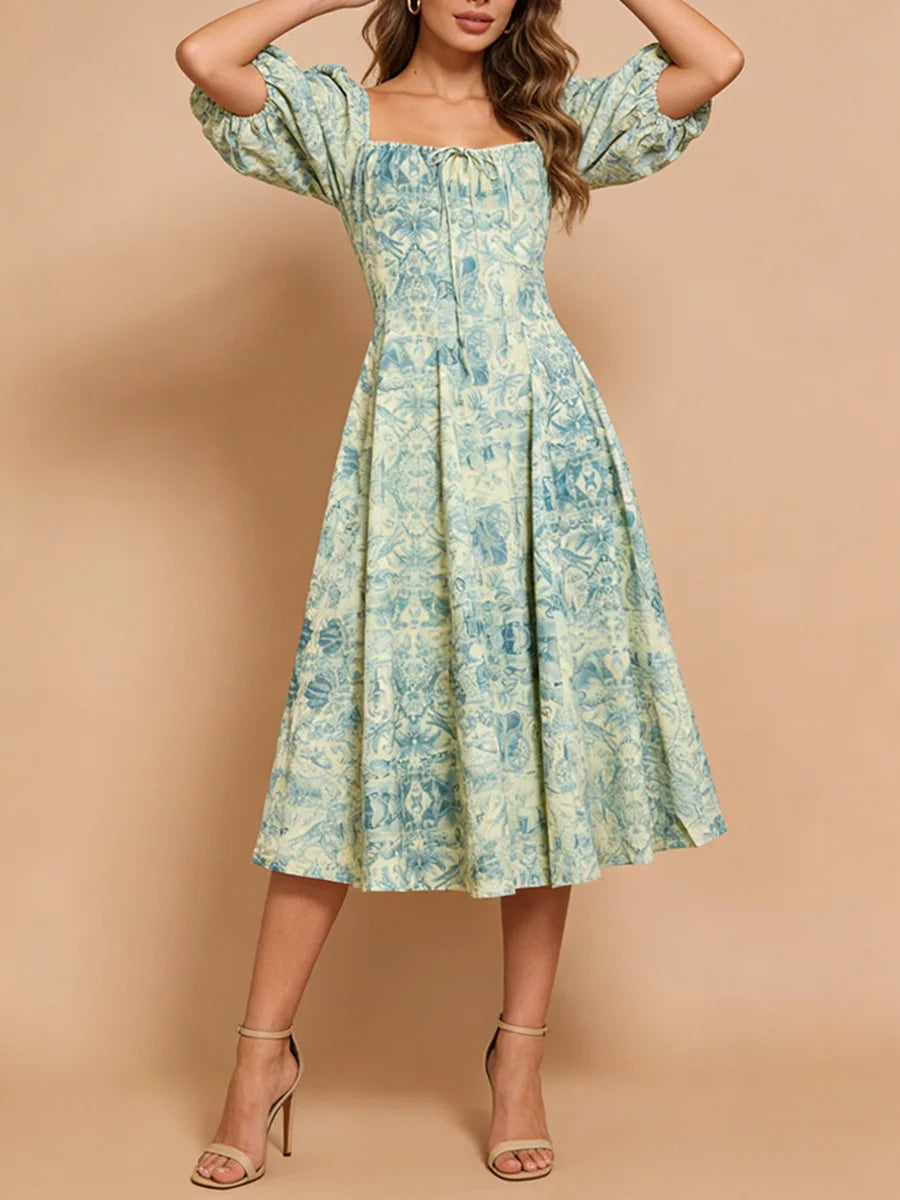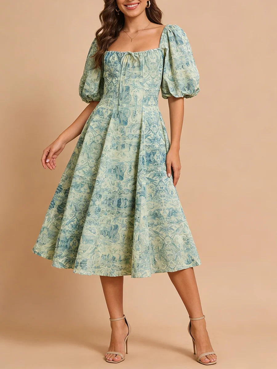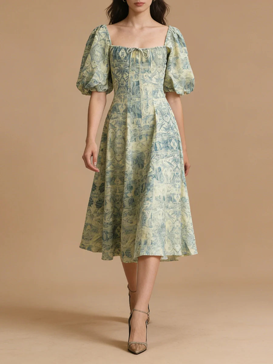 Vintage Toile Puff Sleeve Square-Neck Midi Dress