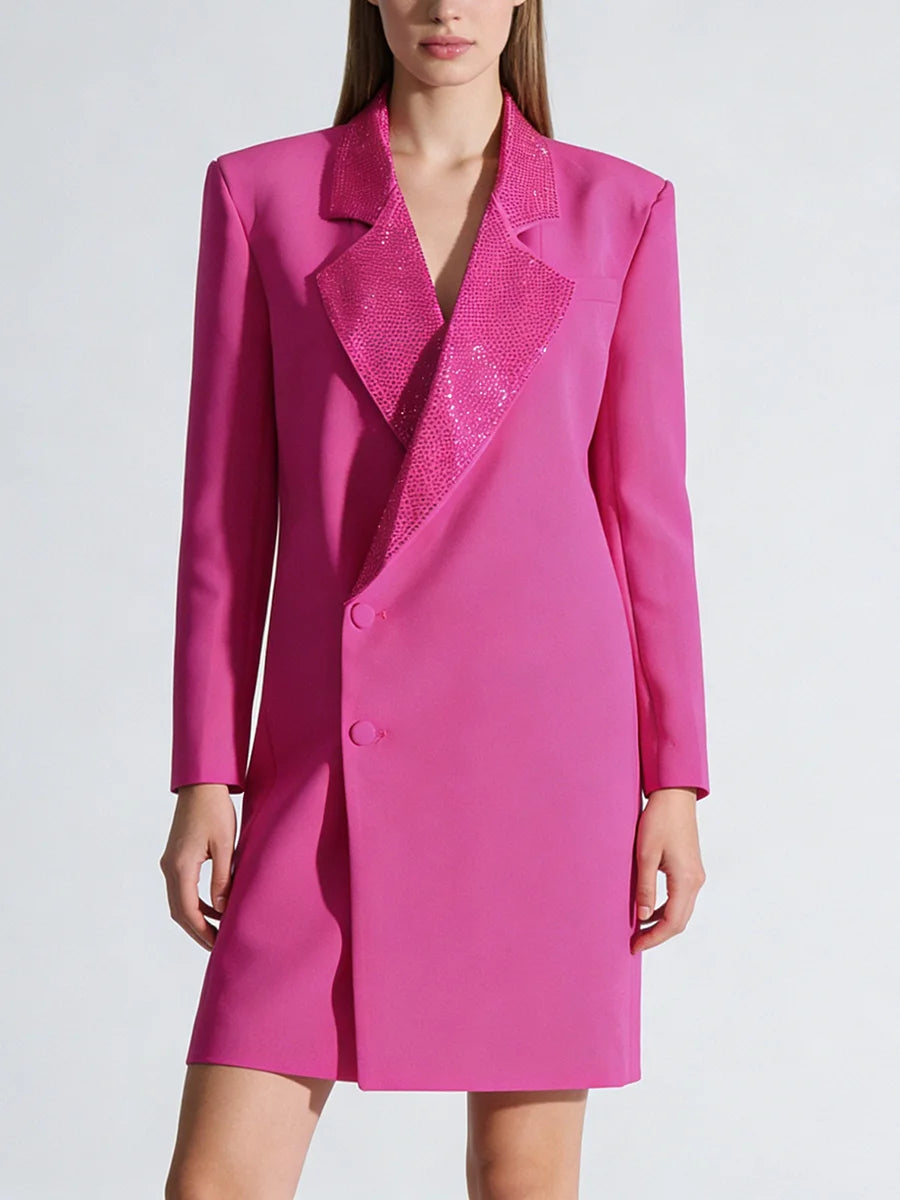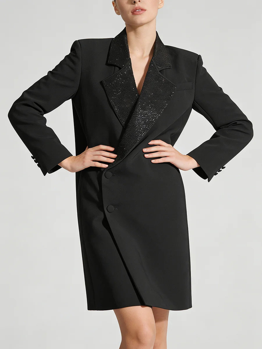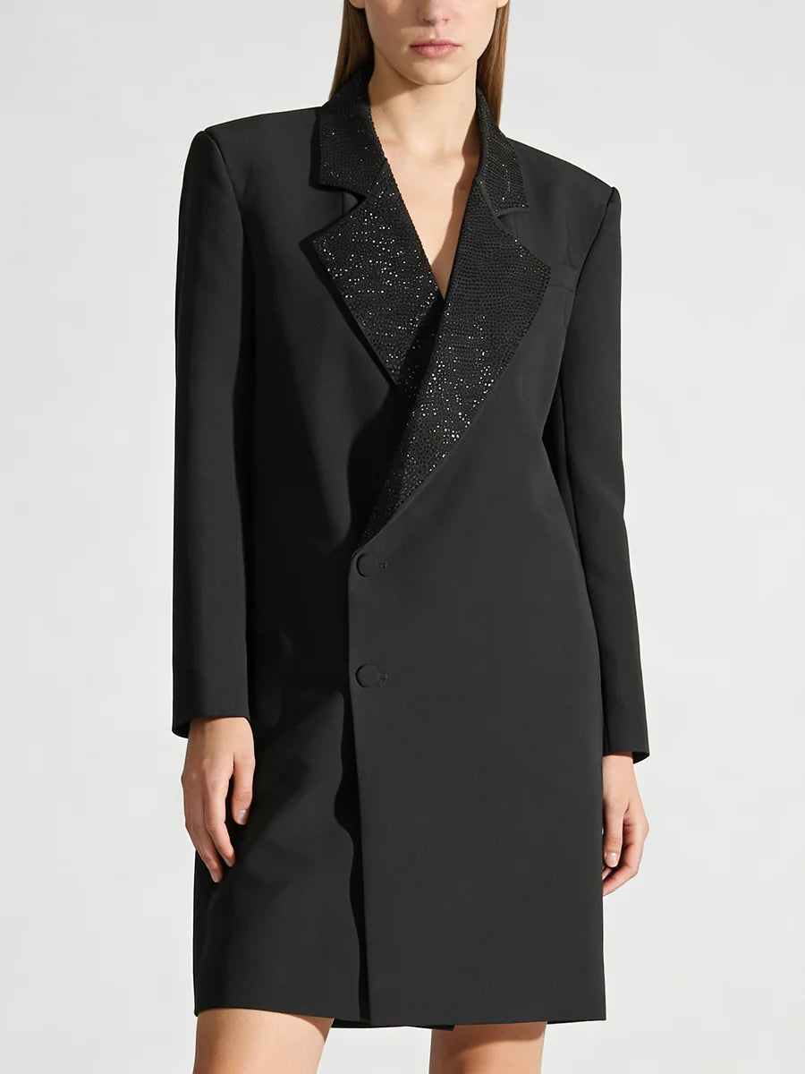 Command attention with this show-stopping couture blazer dress that seamlessly merges boardroom sophistication with evening glamour. The structured silhouette and diamond-embellished notched collar create a statement piece that transitions effortlessly from executive meetings to cocktail soirées.