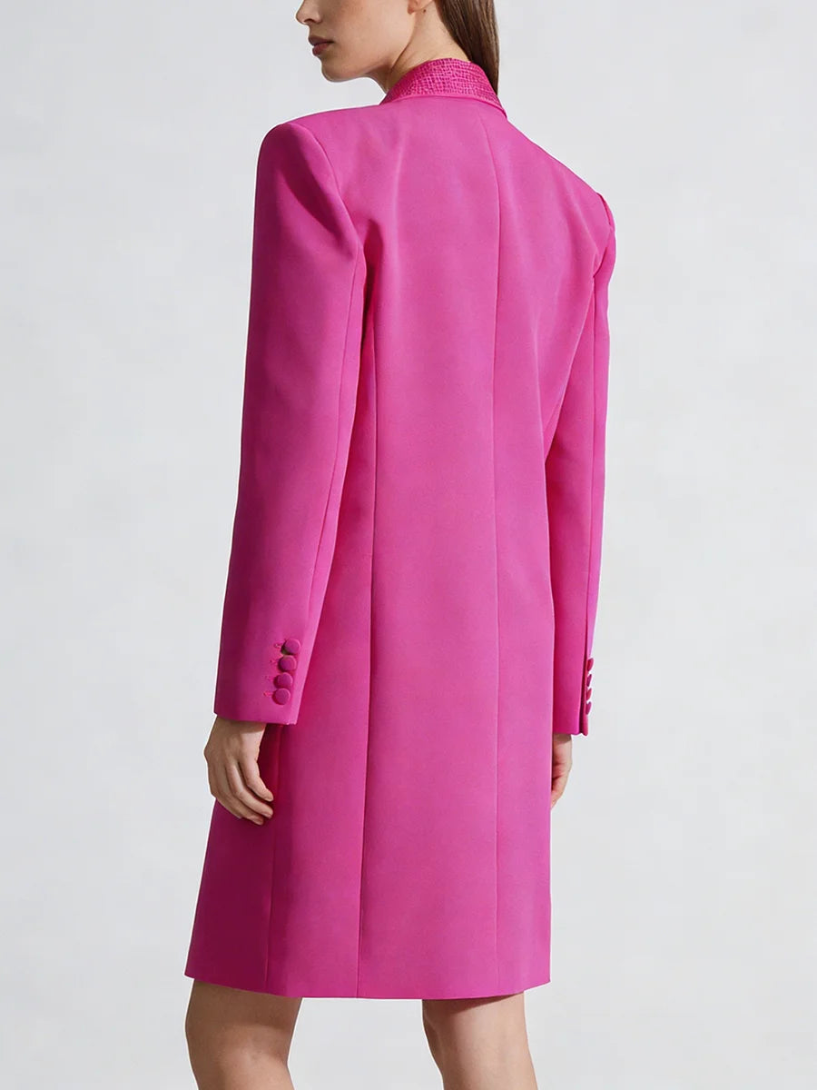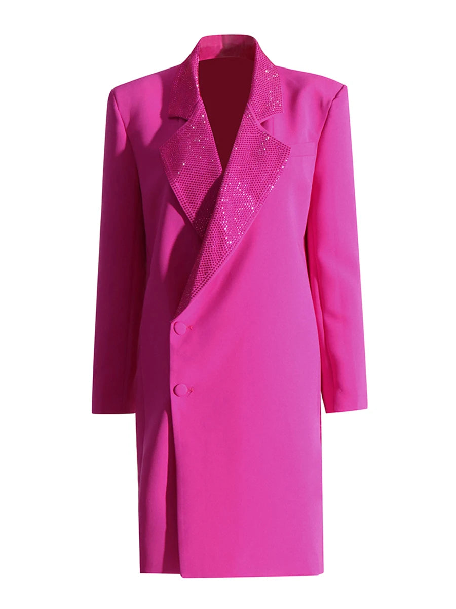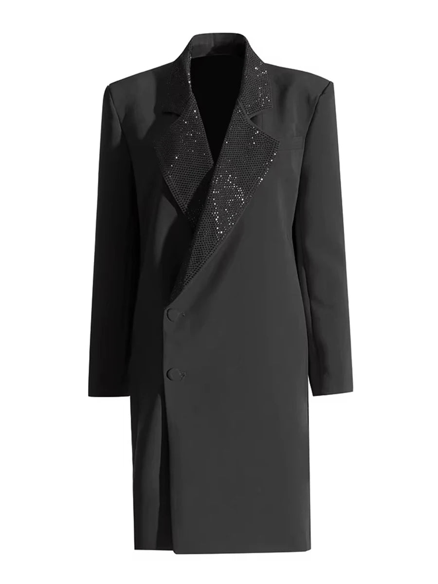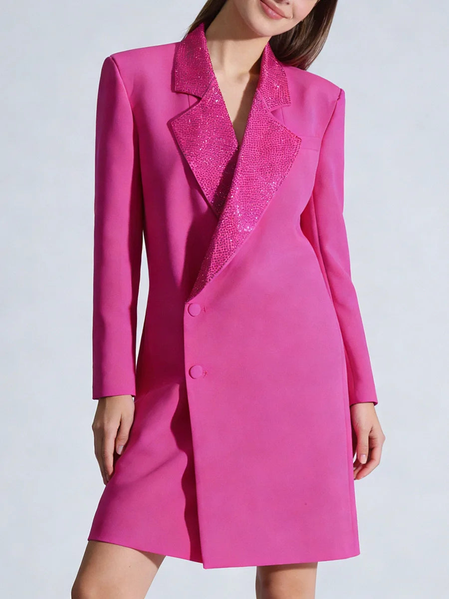 Command attention with this show-stopping couture blazer dress that seamlessly merges boardroom sophistication with evening glamour. The structured silhouette and diamond-embellished notched collar create a statement piece that transitions effortlessly from executive meetings to cocktail soirées.