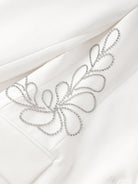 The true standout lies in its spliced crystal embellishments—artfully arranged along the waistline and sleeves to mimic the fluidity of floral motifs. These hand-applied crystal accents shimmer with every movement, adding refined glamour without compromising sophistication.