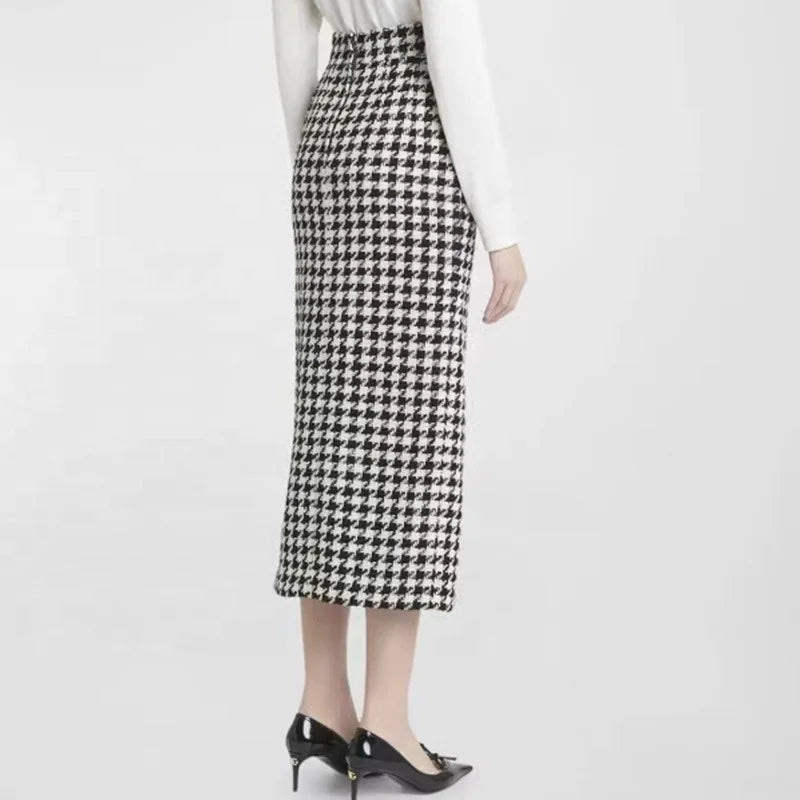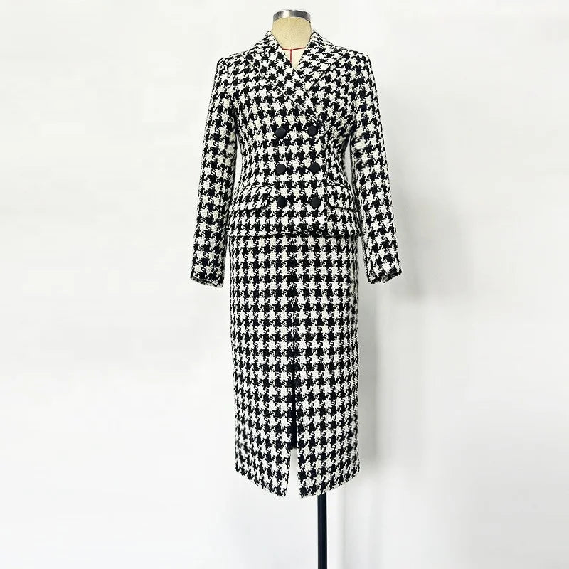 Crafted from premium tweed fabric in an iconic black-and-white houndstooth pattern, this set is perfect for business meetings, stylish fall outings, or upscale events. Wear together for a polished statement or style separately for versatile elegance.