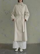 Understated elegance meets modern design with the Trend4us Minimalist High-Collar Belted Longline Coat. Crafted in a refined ivory tone, this piece features a clean longline silhouette, structured high collar with button detail, and an adjustable waist belt for a sleek, tailored finish.