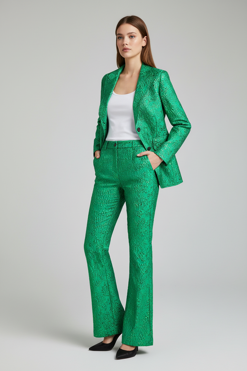 Elevate your wardrobe with the Trend4us Modern Luxe Jacquard Suit Set. This sophisticated two-piece ensemble features a structured blazer with a flattering tailored fit and matching flare pants, both crafted from ornate jacquard fabric with a refined sheen. Perfect for upscale events, formal outings, or statement-making street style.