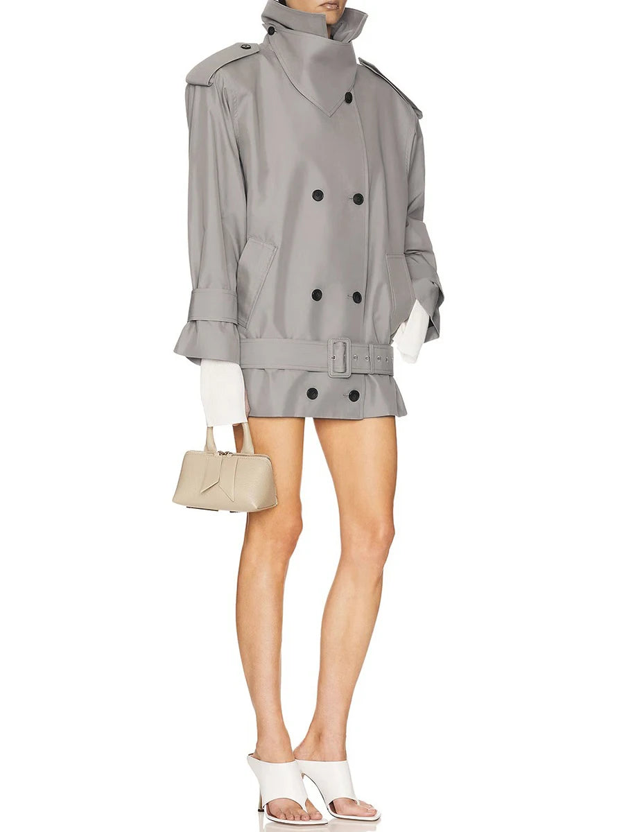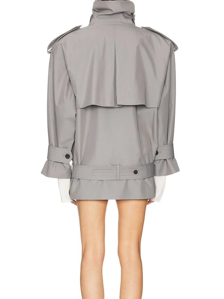 Details: Epaulette accents, belted hem with buckle, side pockets