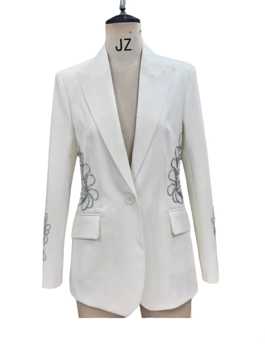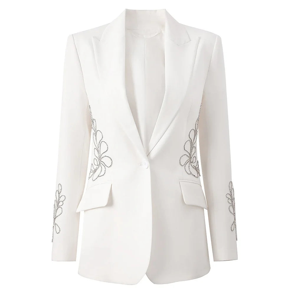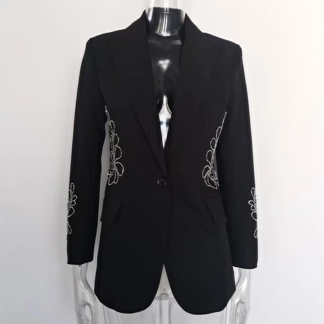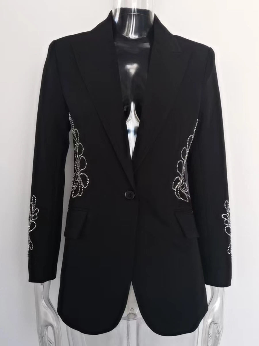 Elevate your wardrobe with opulent detailing. The Luxe Crystal Spliced Embellished Blazer is a striking fusion of modern tailoring and refined glamour, featuring spliced crystal embellishments artfully arranged along the waistline and sleeves.