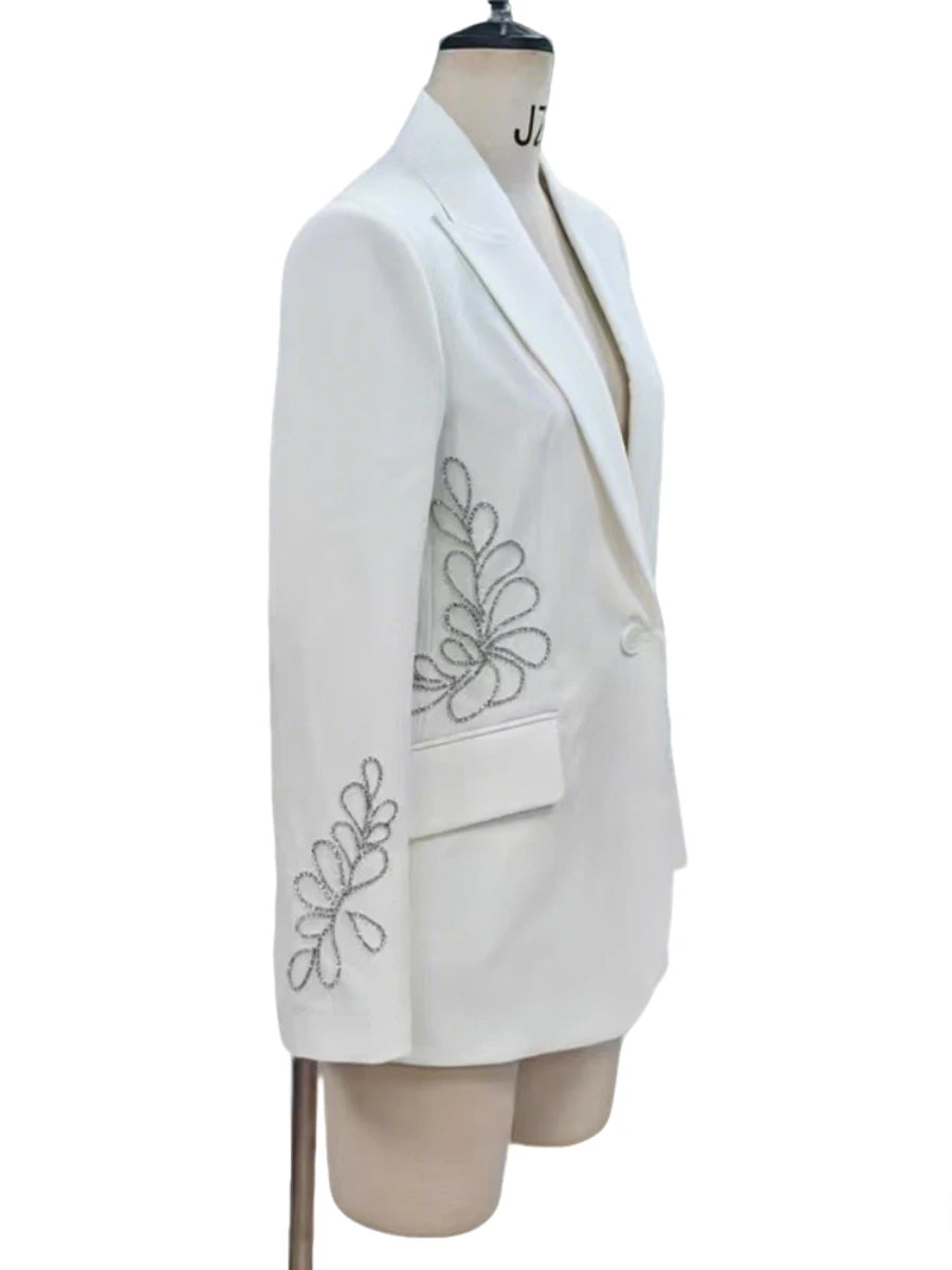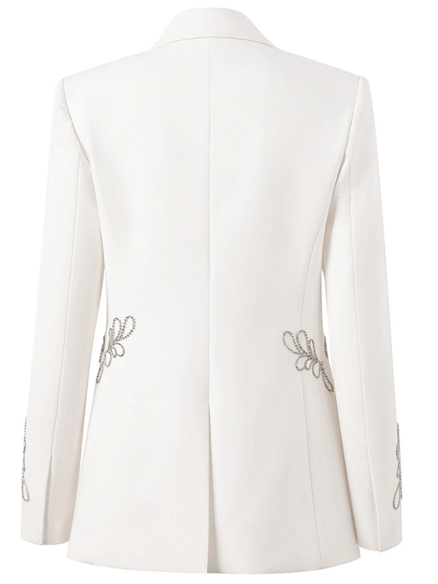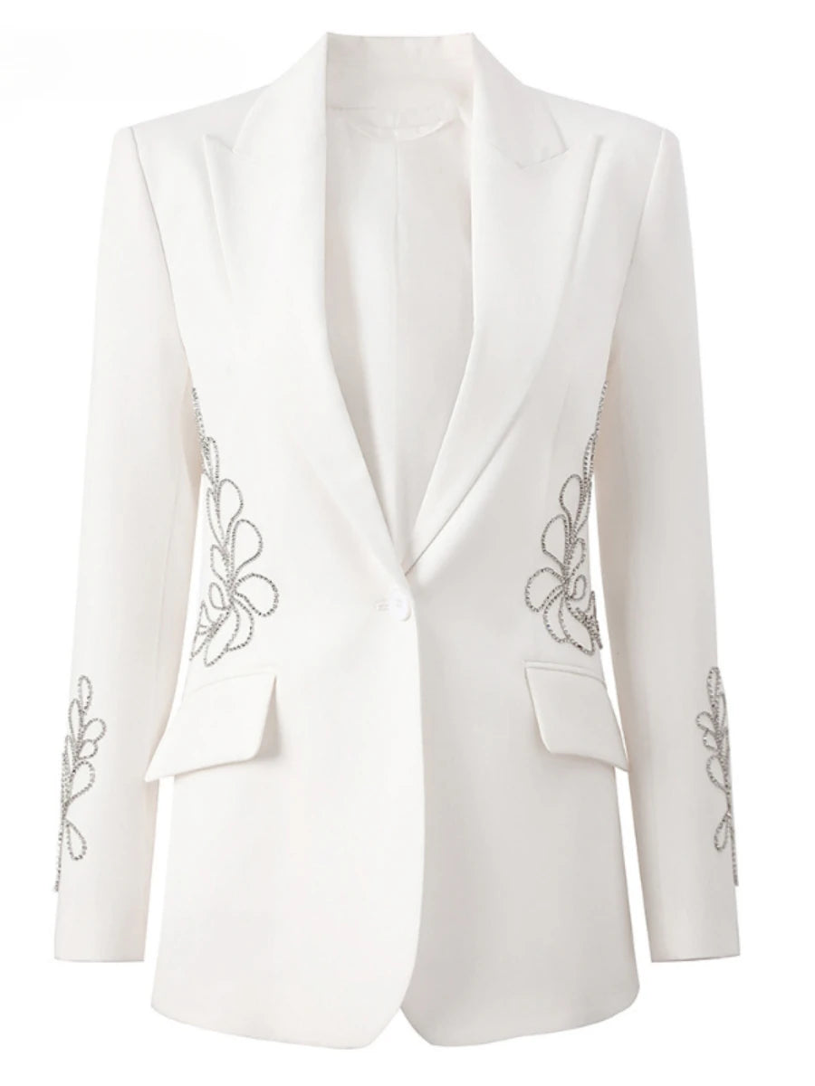 Elevate your wardrobe with opulent detailing. The Luxe Crystal Spliced Embellished Blazer is a striking fusion of modern tailoring and refined glamour, featuring spliced crystal embellishments artfully arranged along the waistline and sleeves.