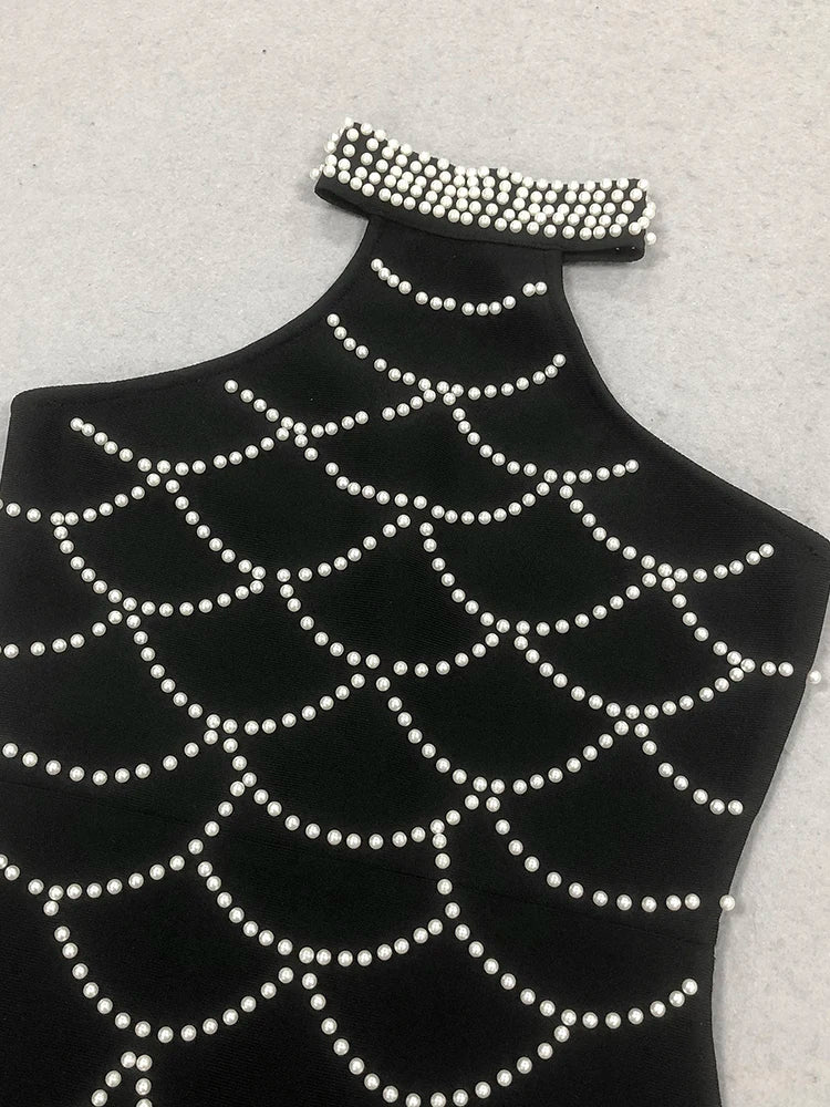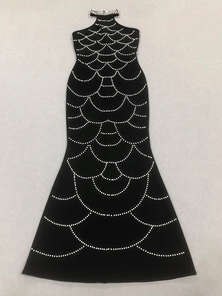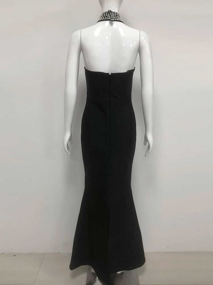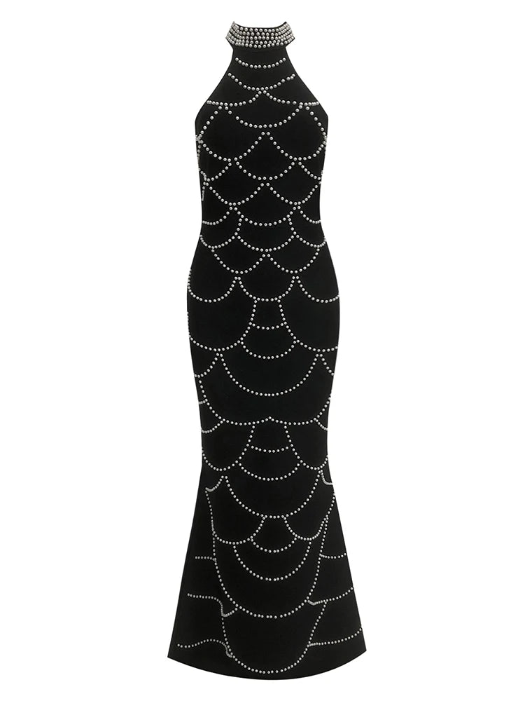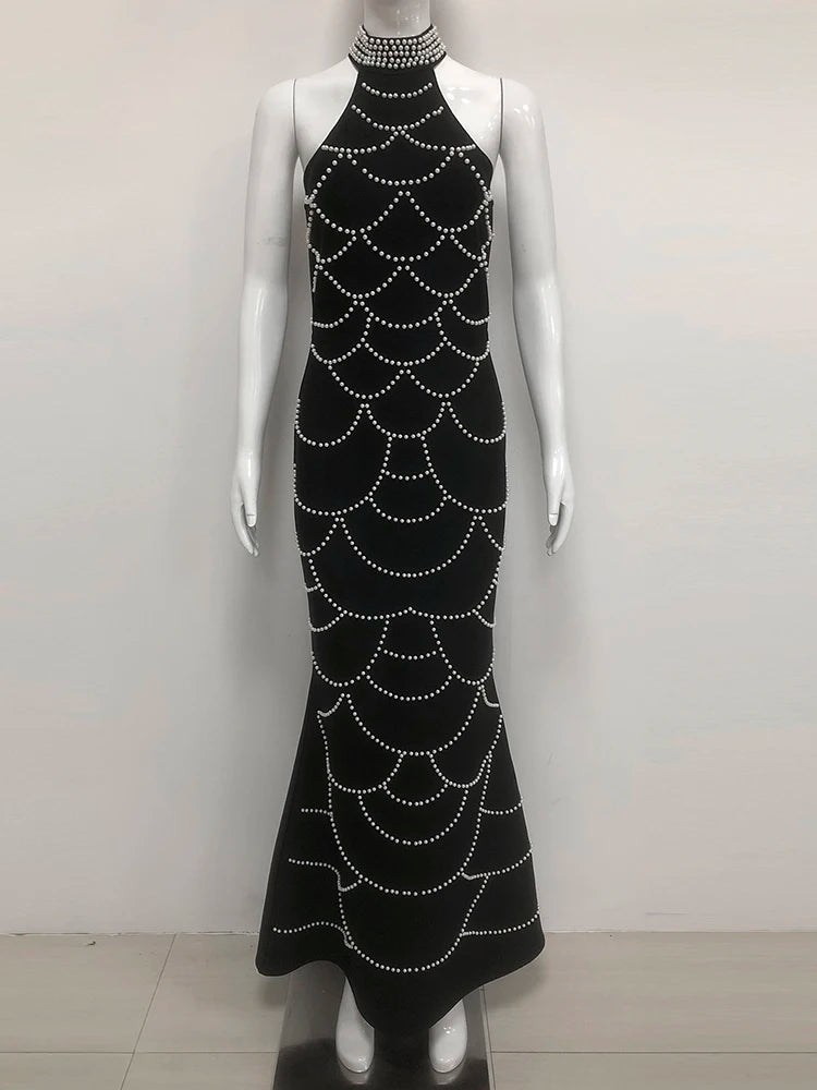 Trend4us Luxe Pearl-Embellished Halter Mermaid Gown