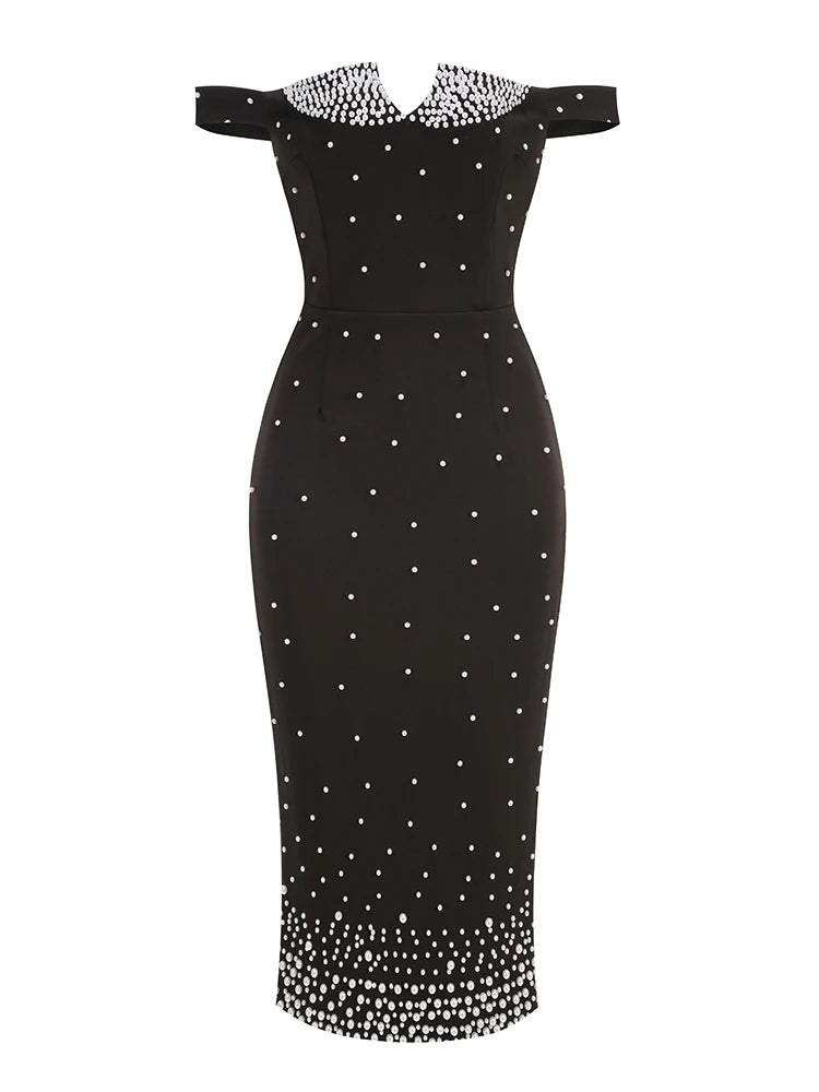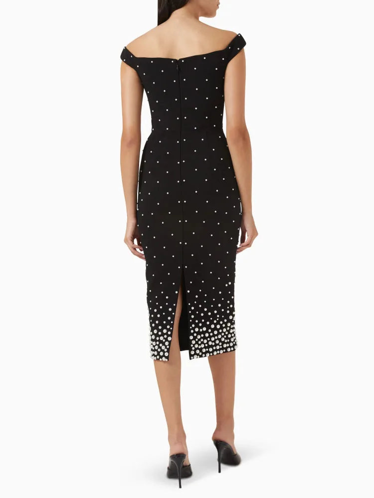 Trend4us Luxe Pearl Embellished Off-Shoulder Midi Dress