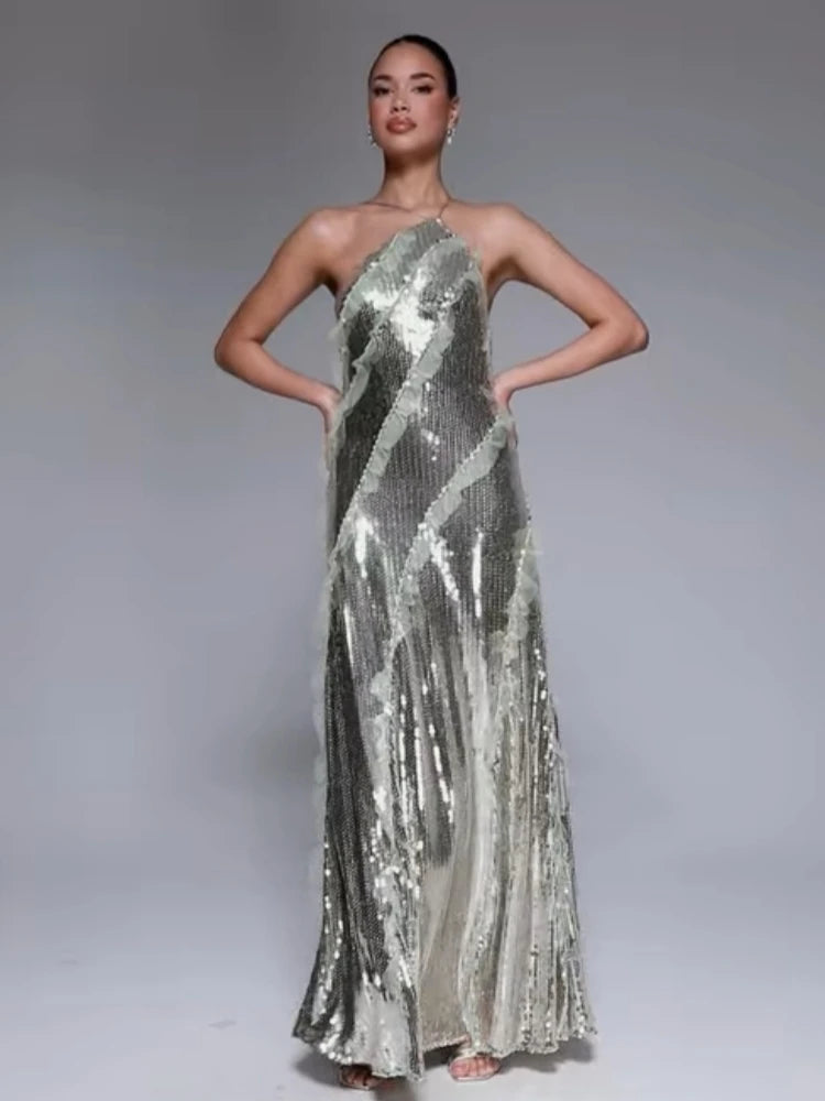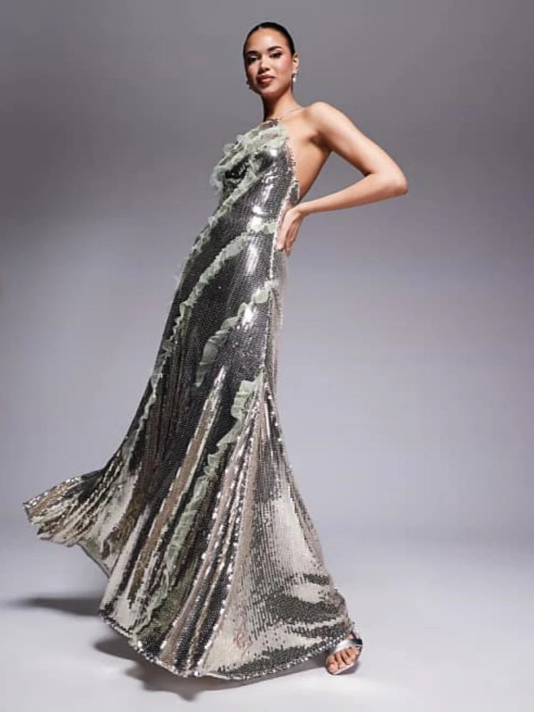Trend4us Luxe Sequin Ruffle Halter Backless Gown