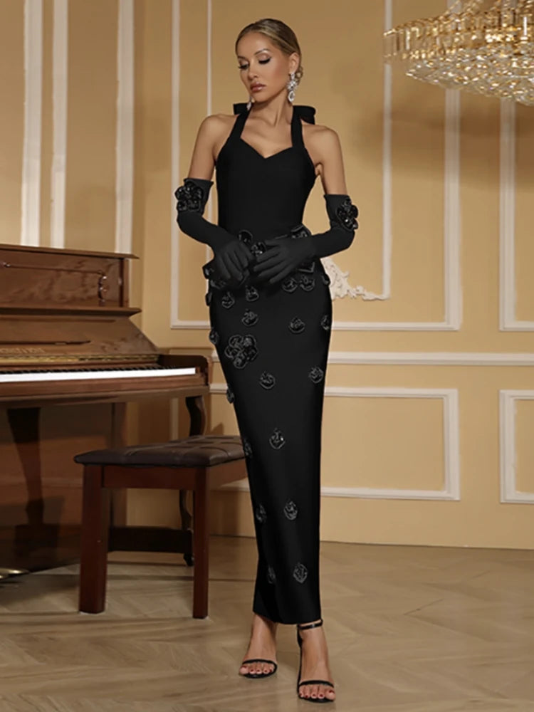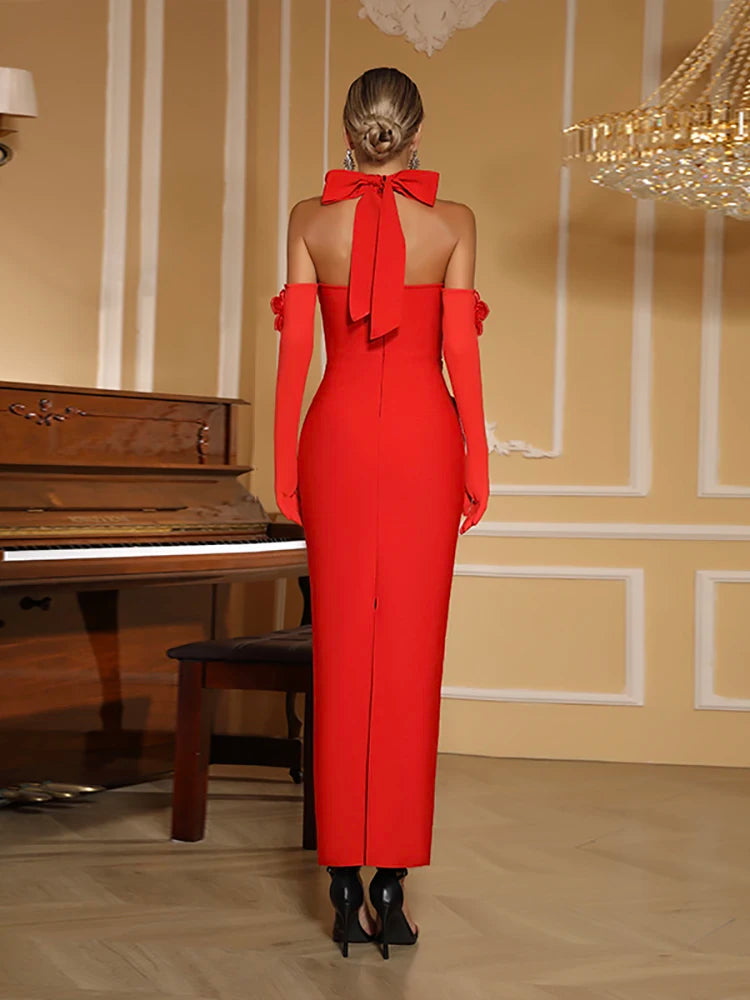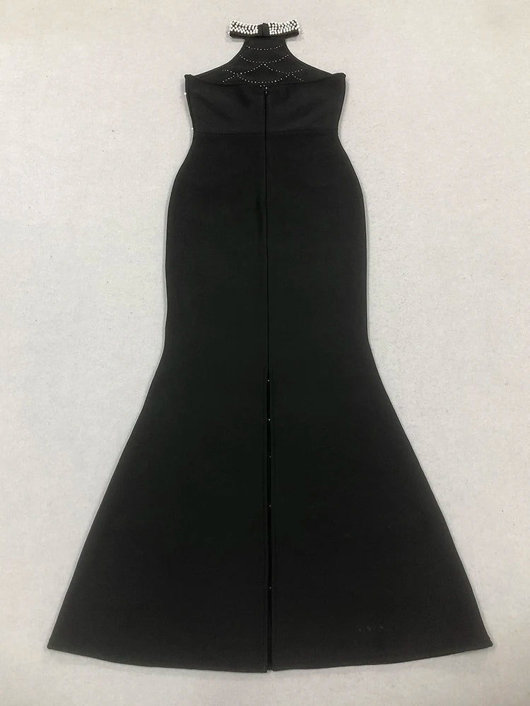 Trend4us Luxe Backless Crystal Bow Halter Maxi Dress