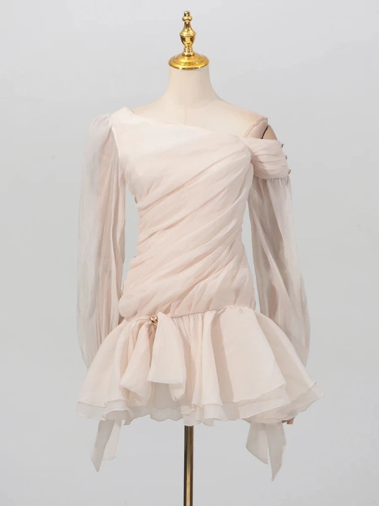 Trend4us Diagonal Long Sleeve Bow Ruffle Mini Dress