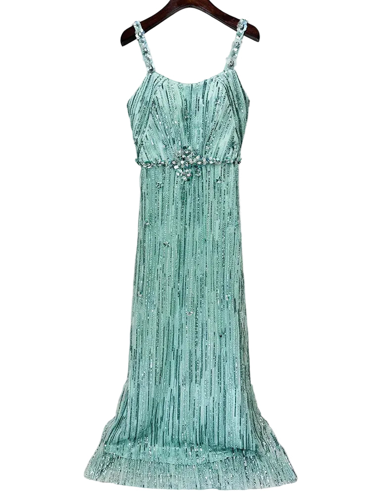 - Embellishment: Vertical Sequin Lines & Beading