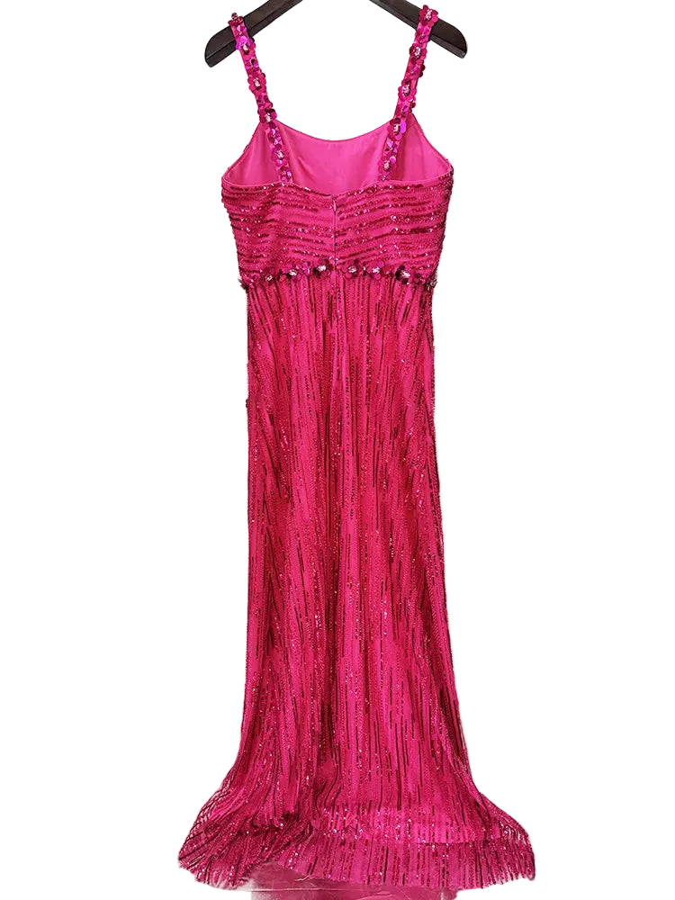 This showstopping gown sparkles on its own—keep accessories minimal with delicate jewelry and elegant heels. The vertical sequin lines create a lengthening effect, while the jeweled floral waist band adds a romantic focal point. Perfect for making unforgettable entrances at galas, weddings, and red carpet events.