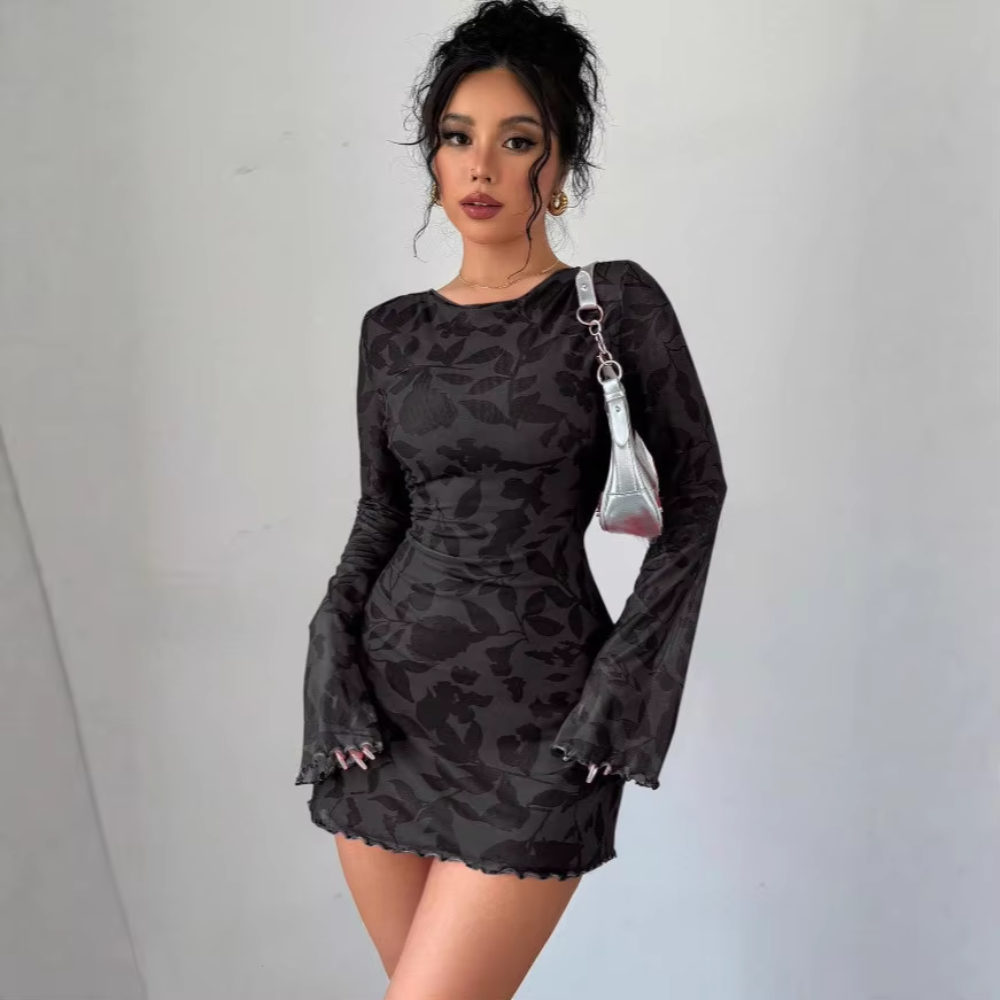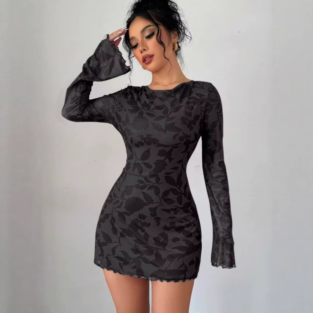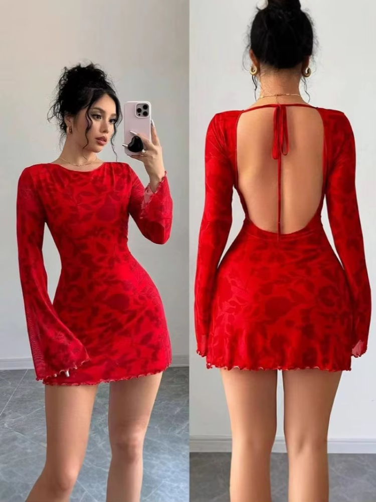 Turn heads with the Trend4us Backless Floral Lace Mini Dress, a sultry yet elegant piece crafted for modern glamour. Featuring long semi-sheer lace sleeves, a figure-hugging silhouette, and a stunning open-back design with tie closure, this dress is perfect for date nights, parties, and special occasions. The floral lace overlay adds a romantic touch, while the mini length highlights your legs for a bold, confident look.