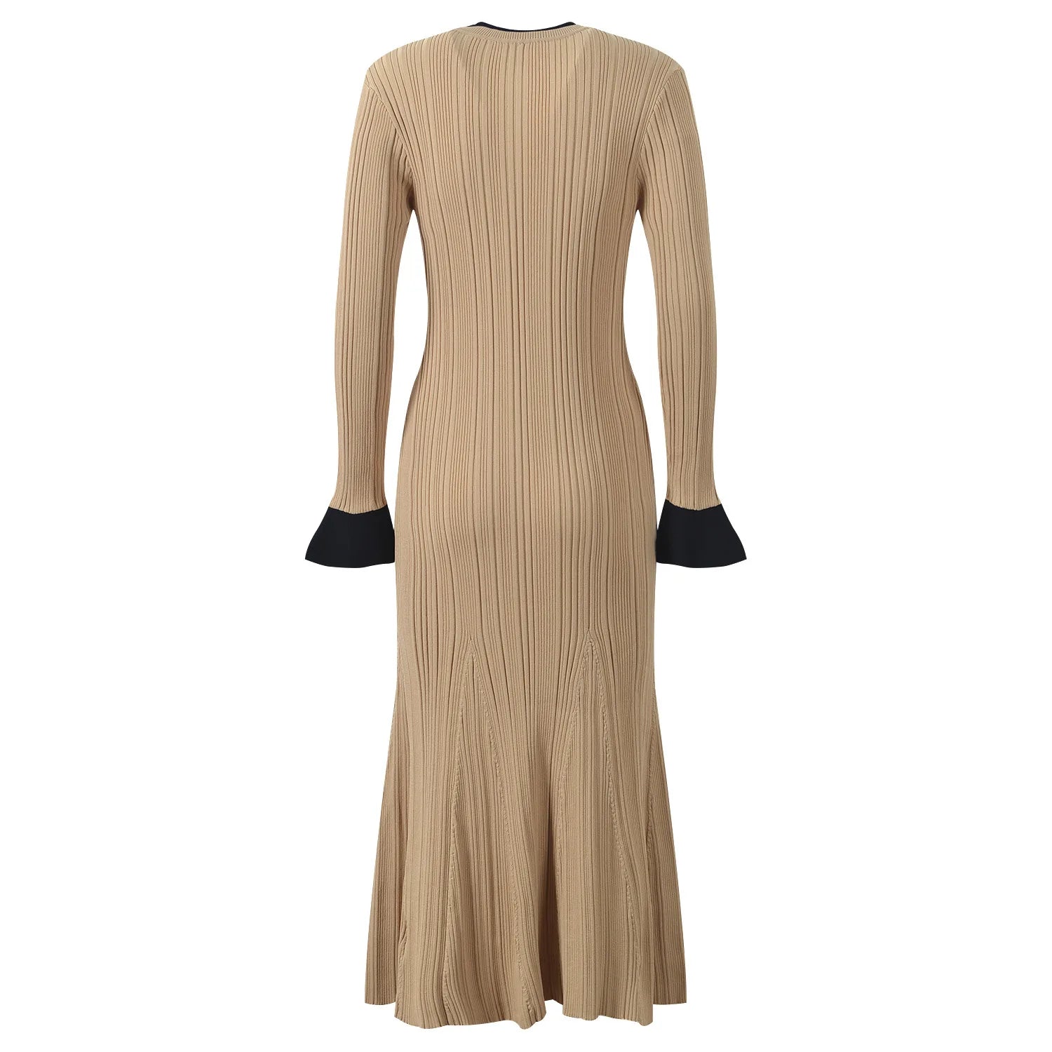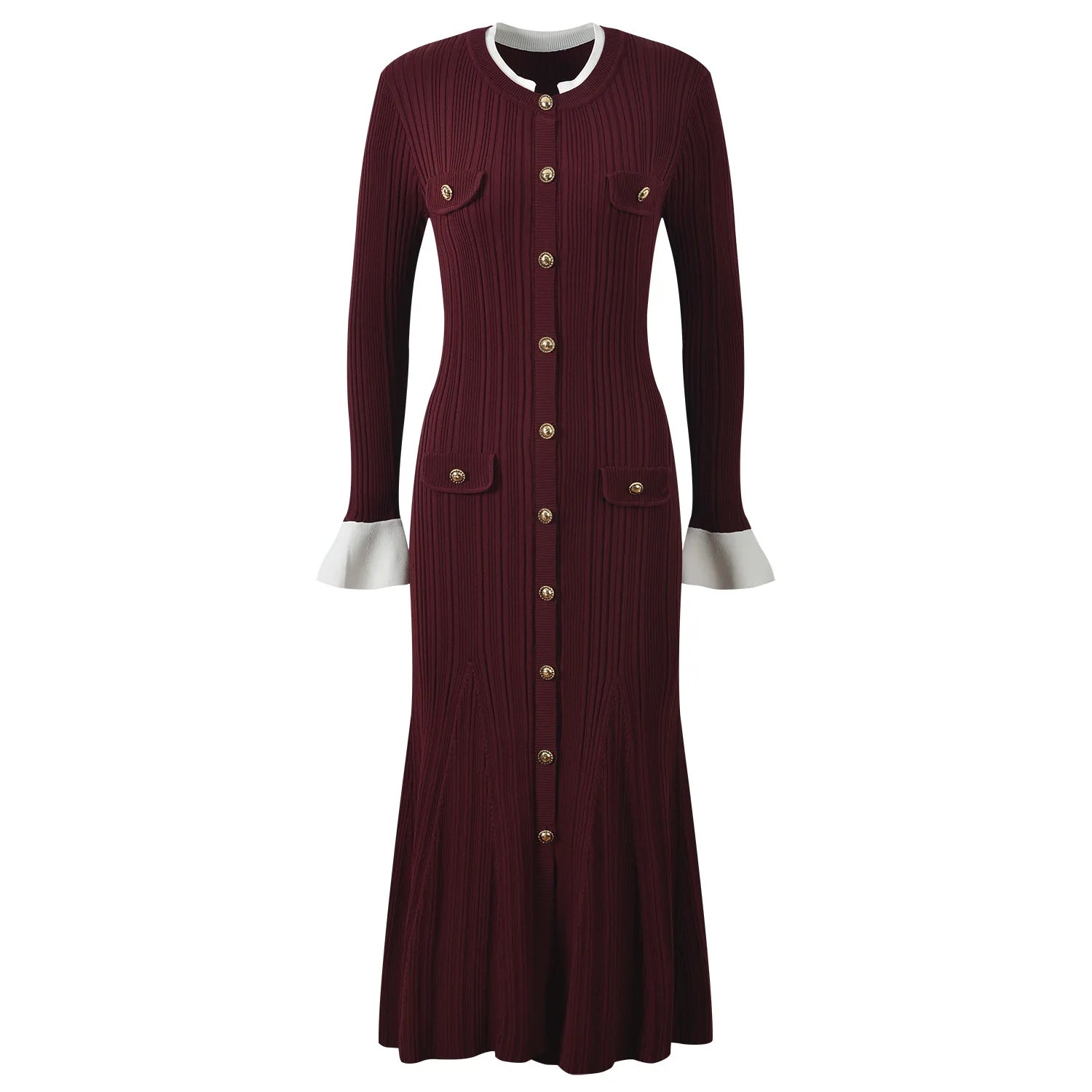 Elevate your wardrobe with the Trend4us Vintage Knit Buttoned Maxi Flare Dress, a timeless piece crafted for elegance and comfort. Made from a premium ribbed knit fabric, this full-length dress features a flattering silhouette with a softly flared hem. Gold-tone buttons run down the front for a classic touch, while four flap pockets add both style and functionality. The contrast trim at the collar and cuffs lends a refined, tailored finish. Perfect for transitional seasons, this dress blends vintage charm with modern sophistication—ideal for work, brunch, or chic evenings out.