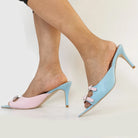 Add a playful yet sophisticated touch to your look with the Trend4us Pastel Two-Tone Bow Crystal Mule Heels. Featuring a sleek pointed-toe silhouette, these heels combine soft pastel pink and blue tones for a chic color-block effect. The double bow straps adorned with sparkling crystal embellishments bring glamour and femininity, while the slip-on mule style ensures effortless elegance. Finished with a slim stiletto heel, they’re the perfect choice for parties, evenings out, or elevating everyday fashion.