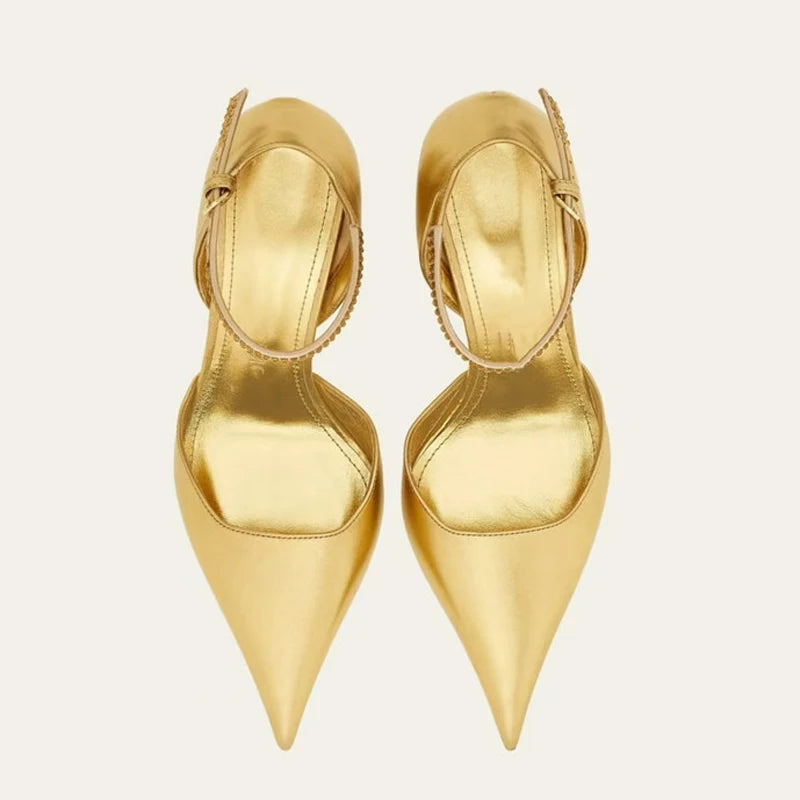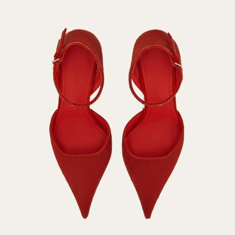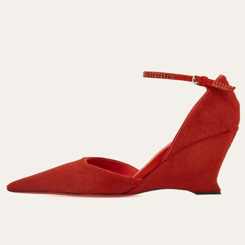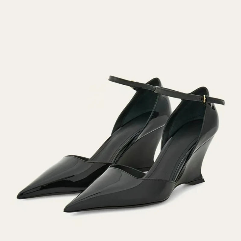Elevate your wardrobe with the Trend4us Pointed Wedge Heels with Ankle Strap. Designed with a sleek pointed toe and a sculpted wedge heel, these shoes blend sophistication and comfort. The adjustable ankle strap ensures a secure fit, while the minimal silhouette makes them ideal for everything from office wear to evening outings.