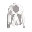 Elevate your wardrobe with the Trend4us Backless Bow Tie Button-Up Blouse — a statement piece that combines classic sophistication with contemporary flair. This chic blouse features a crisp button-up front with a tailored collar, exuding an effortlessly polished look.