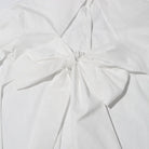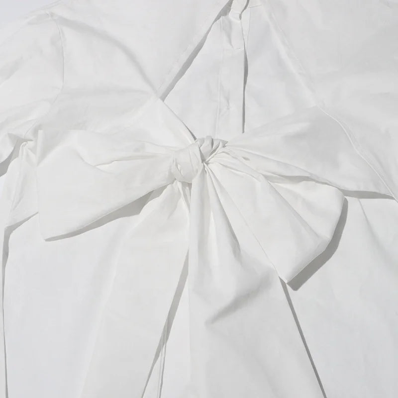 The highlight of this stunning blouse is the daring open back, accentuated with an oversized bow tie that adds a touch of drama and elegance. The voluminous bow not only enhances the silhouette but also makes it an eye-catching fashion statement from every angle.