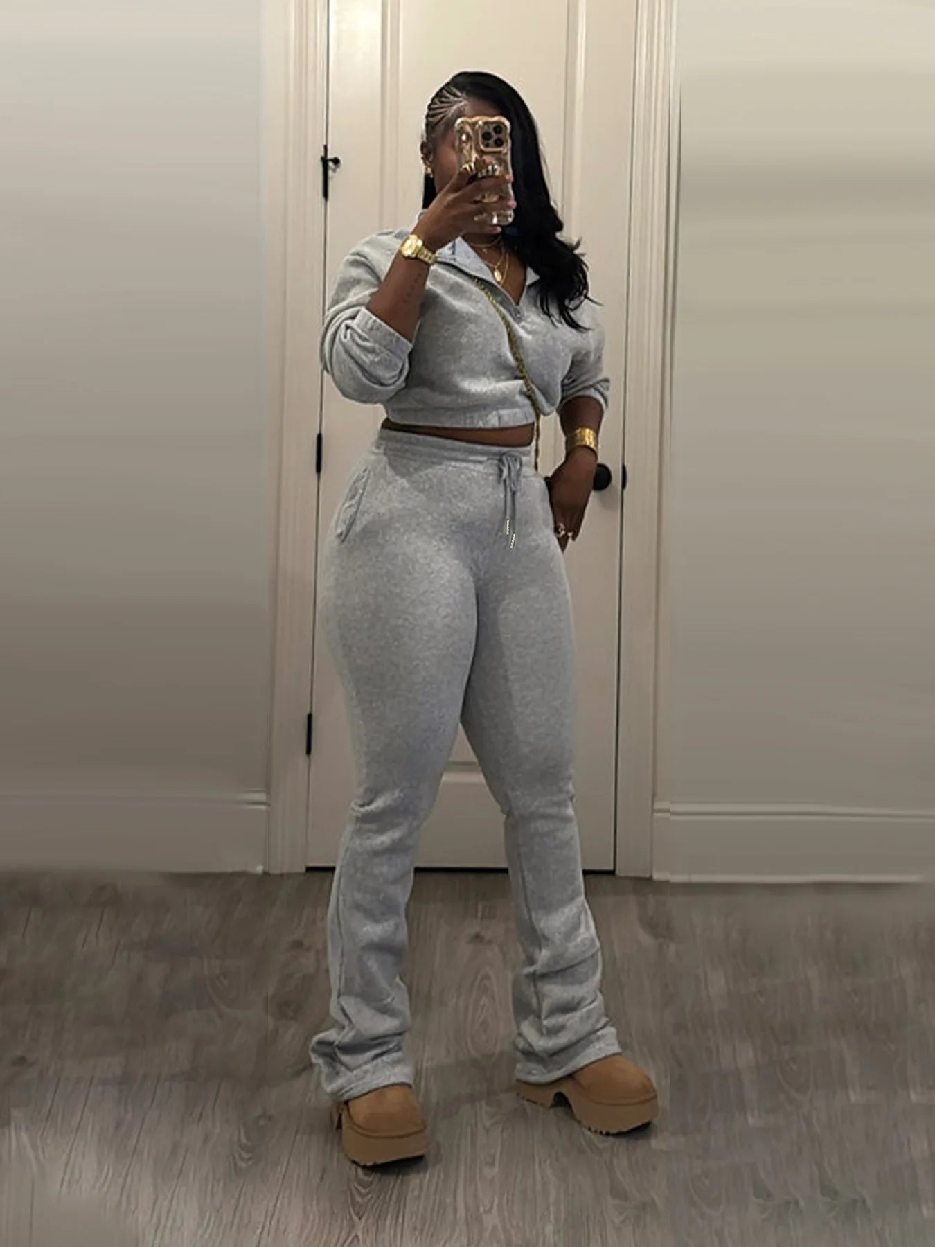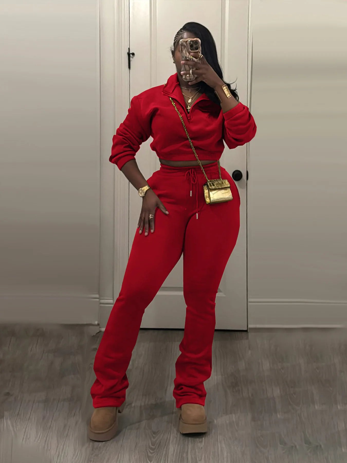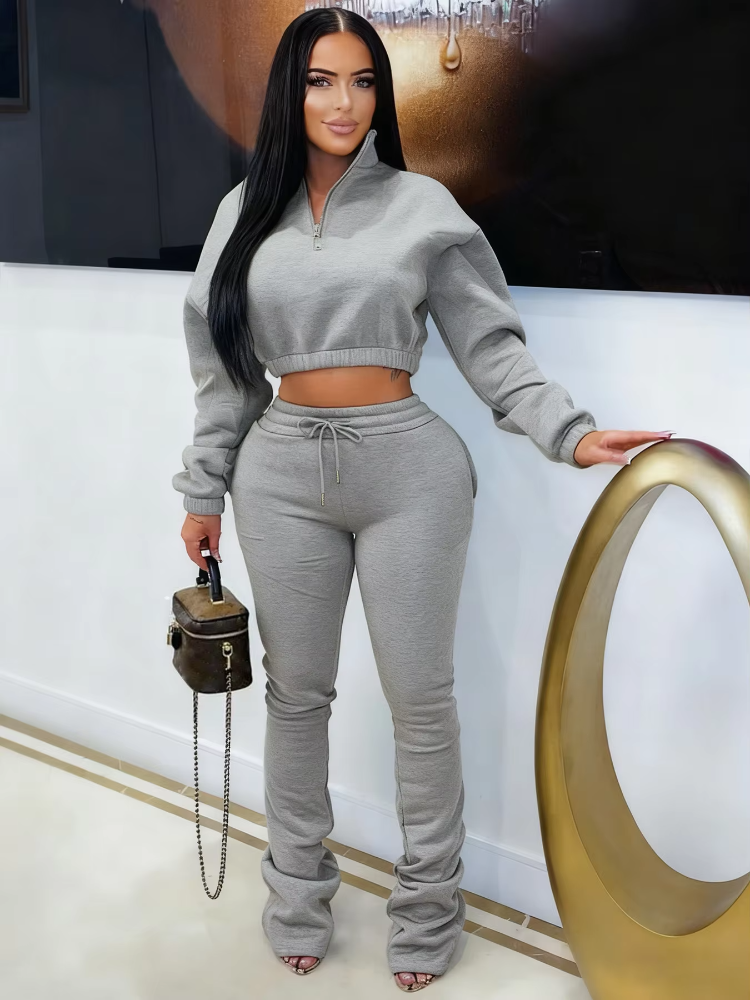Elevate your everyday style with the Trend4us Classic Half-Zip Crop Sweatshirt & Flare Jogger Set — the perfect balance of comfort, structure, and modern edge. Designed to sculpt while staying ultra-comfortable, this two-piece set features a cropped half-zip sweatshirt with a relaxed fit and high-waisted flare joggers that elongate the legs effortlessly.
