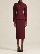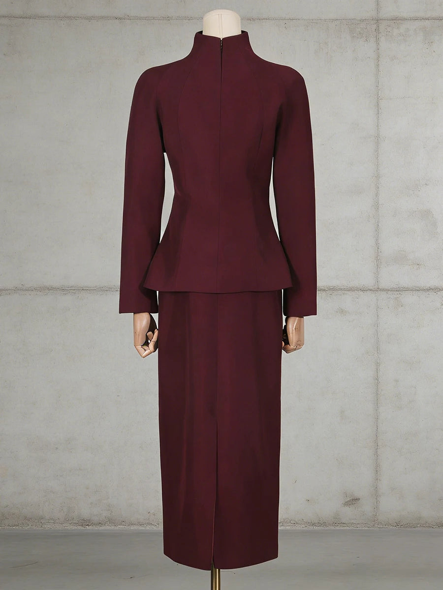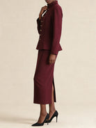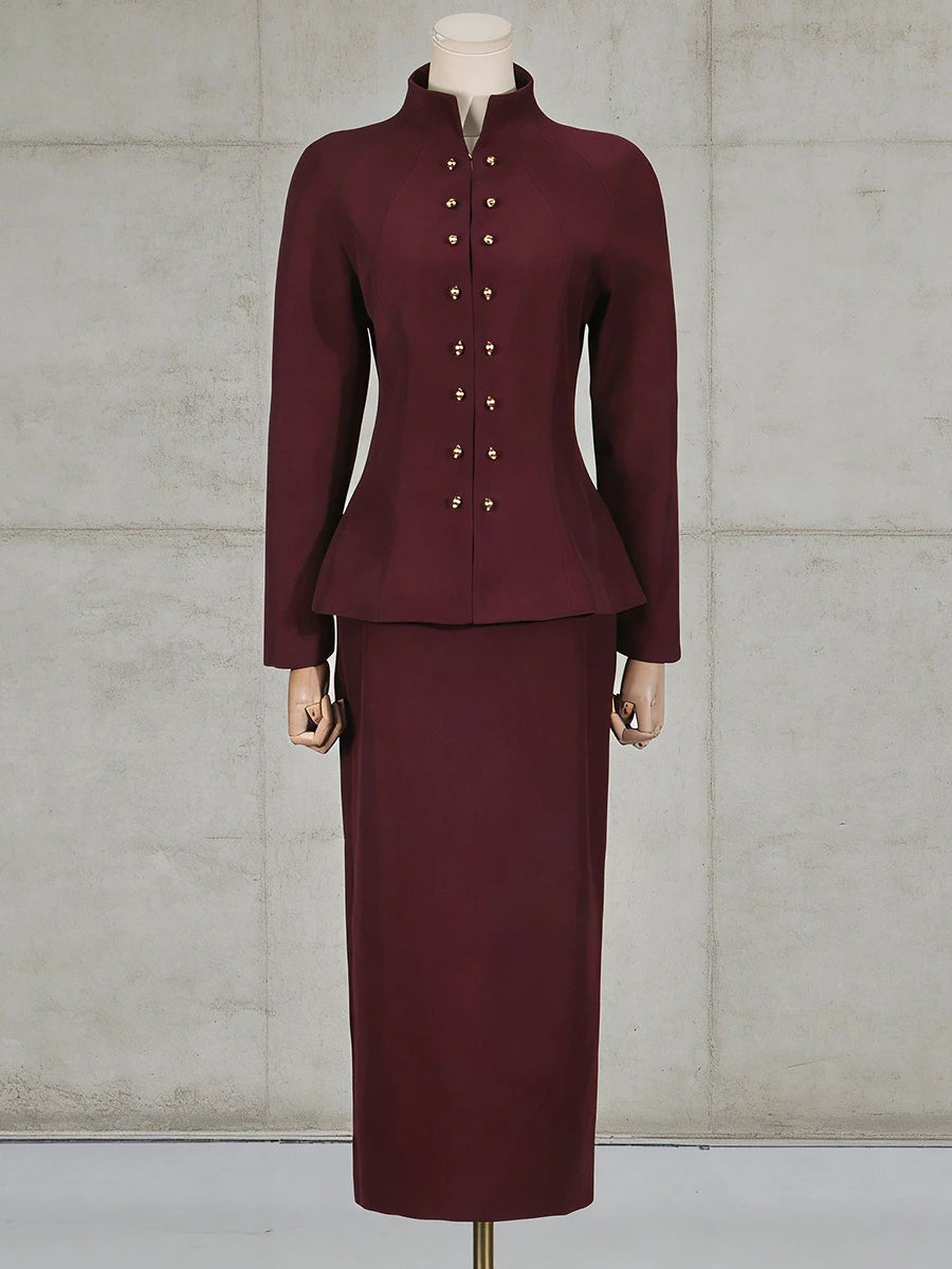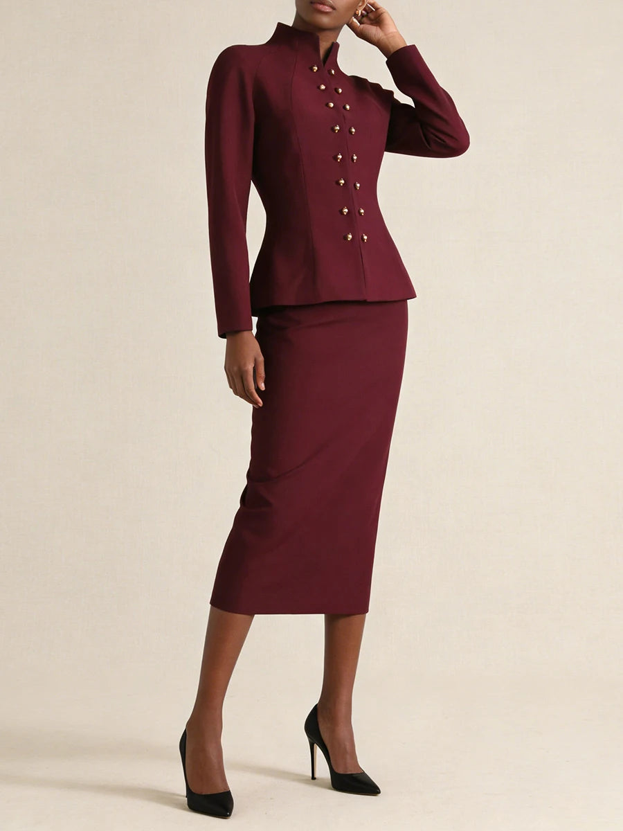 Command the room in this sophisticated two-piece set featuring a tailored high-neck blazer and flattering A-line pencil skirt. The perfect power ensemble that combines professional polish with modern elegance.