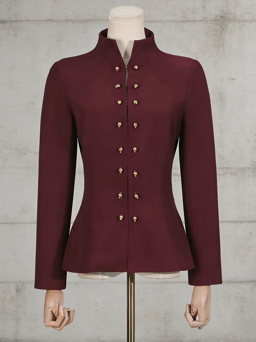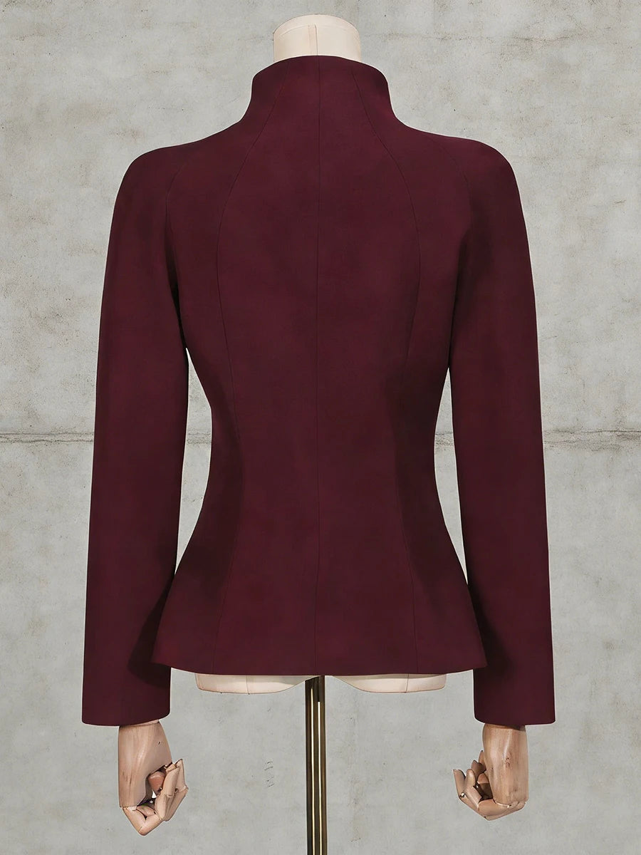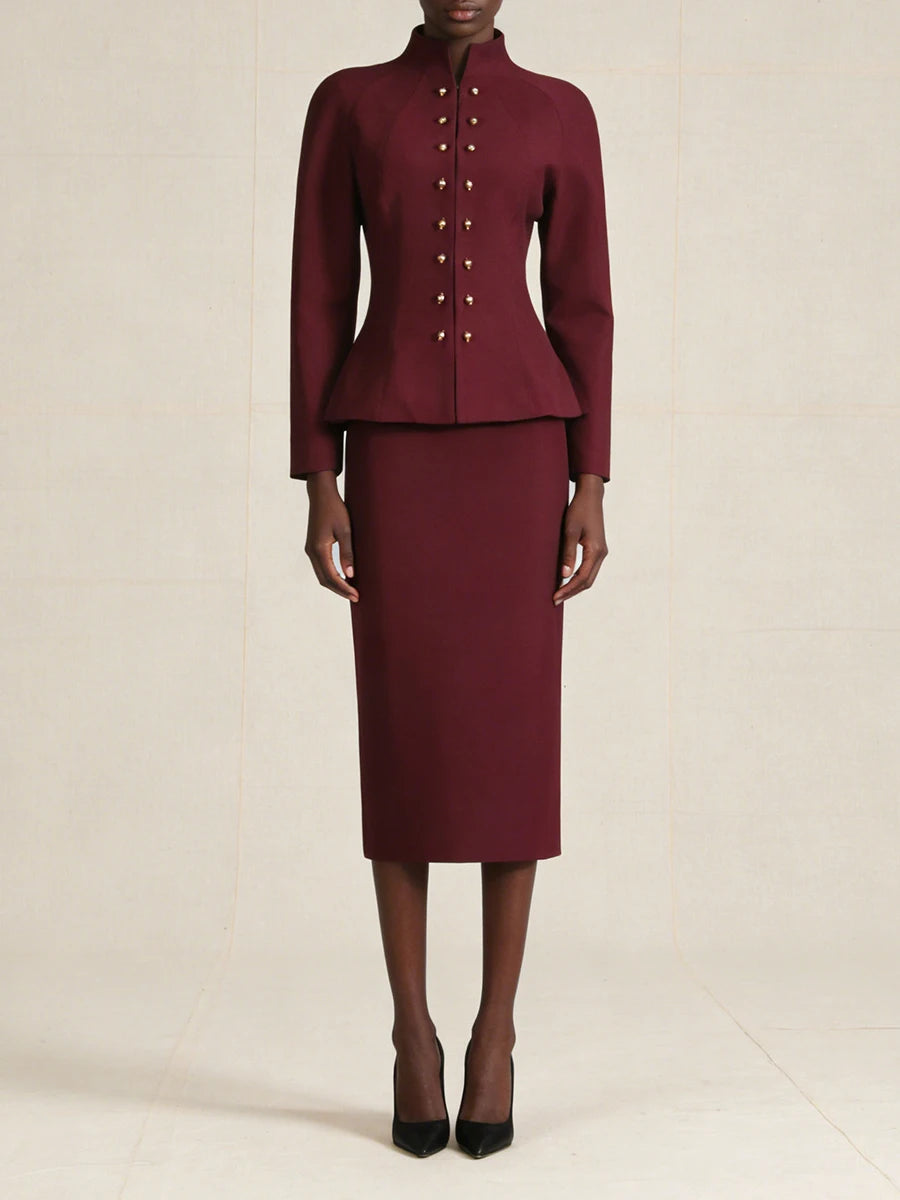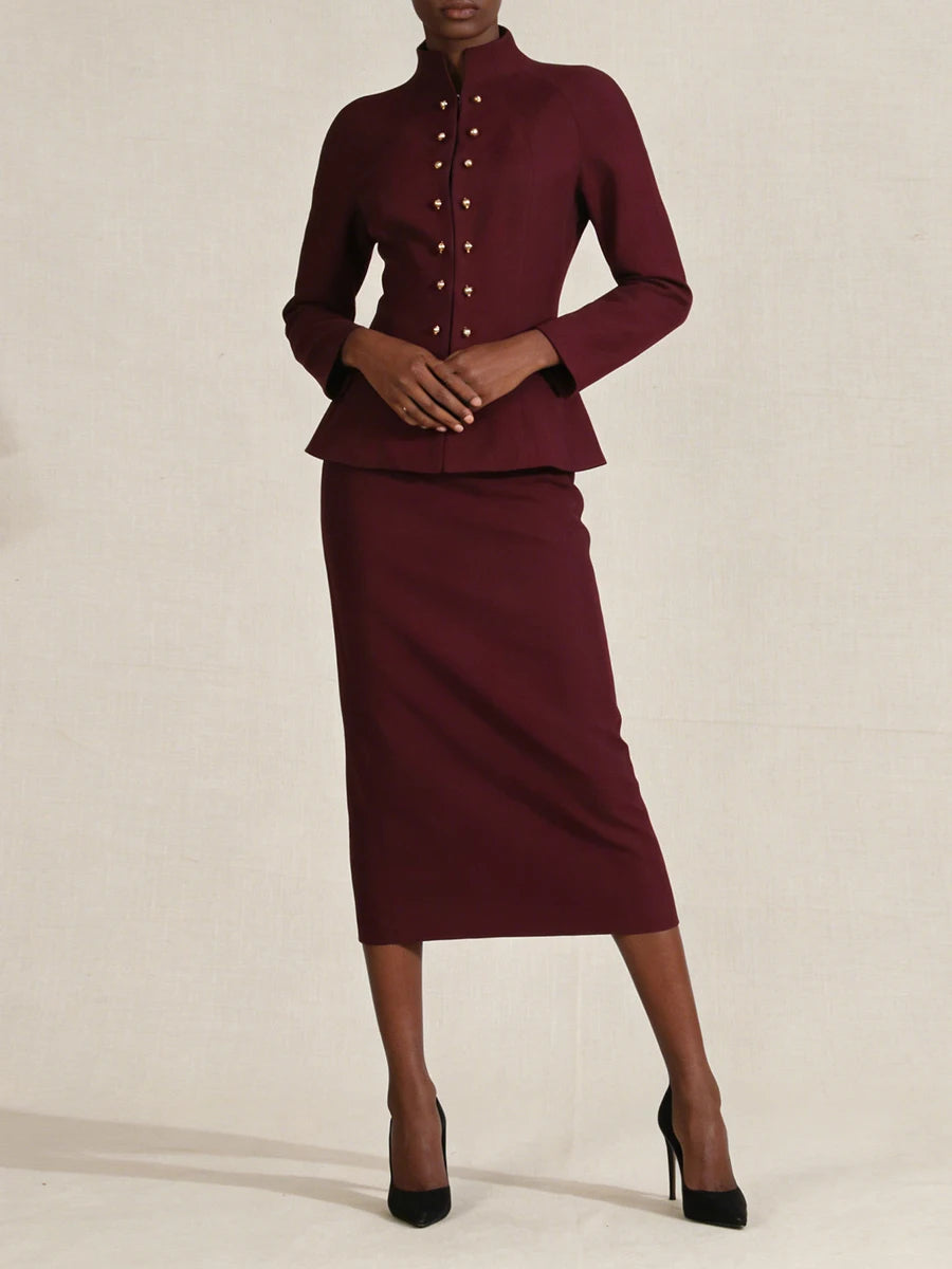 Command the room in this sophisticated two-piece set featuring a tailored high-neck blazer and flattering A-line pencil skirt. The perfect power ensemble that combines professional polish with modern elegance.