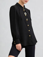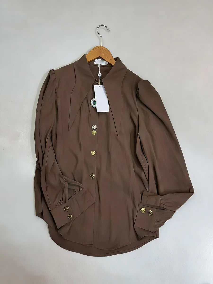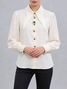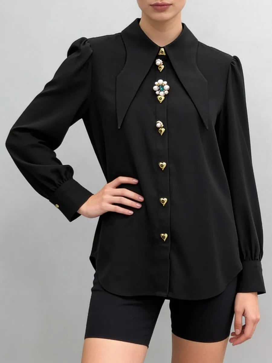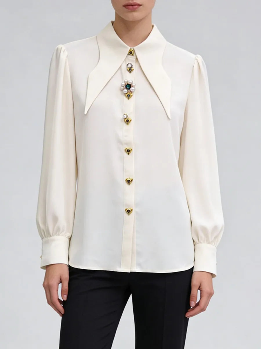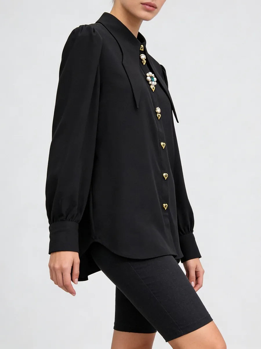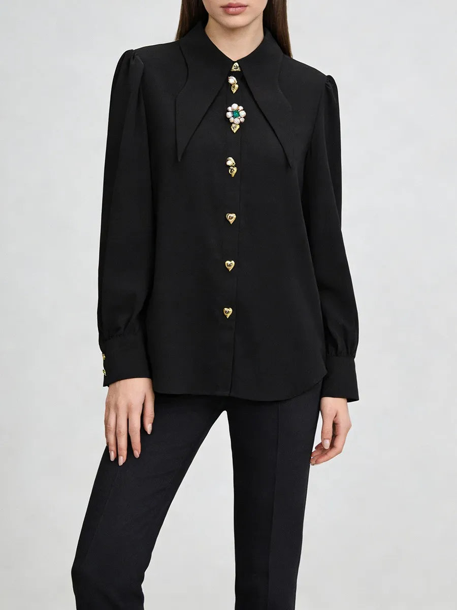 Trend4us Elegant Jewel-Button Pointed Collar Long-Sleeve Blouse